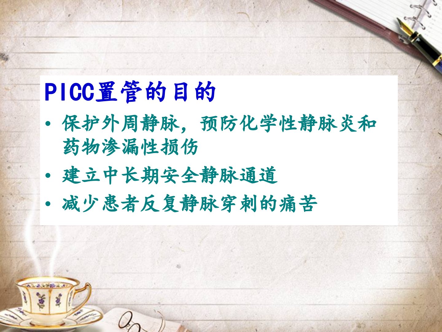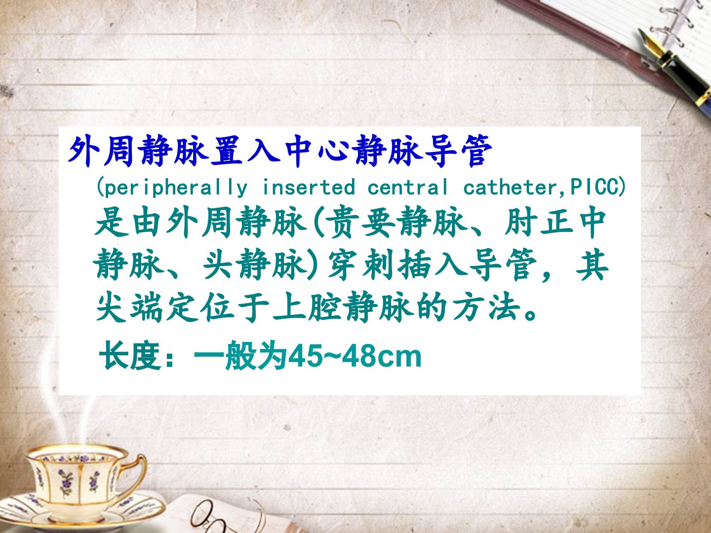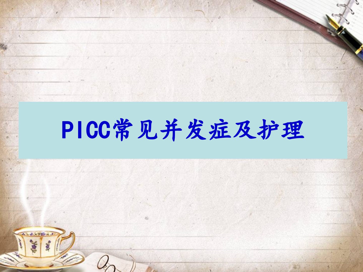 PICC(外周静脉置入中心静脉导管)通过外周静脉(贵要静脉首选肘正中次选头静脉第三选择)穿刺导管尖端定位于上腔静脉旨在保护外周静脉预防化学性静脉炎和药物渗漏性损伤减少患者反复穿刺的痛苦。常见并发症及护理包括:渗血血肿应避免穿刺后过度活动加压止血;心律失常与导管尖端位置过深有关需准确测量静脉长度轻柔递管;刺激神经应避免穿刺过深;空气栓塞以预防为主;导管移位需妥善固定及时重新定位;送管困难应等待放松或重新穿刺;拔导丝困难不得强行送管;感染应严格执行无菌操作局部加强换药必要时拔管;堵管应溶栓或拔管;局部皮疹可暂时用纱布固定严重时皮肤科会诊;拔管困难可稍等片刻或热敷后再拔。