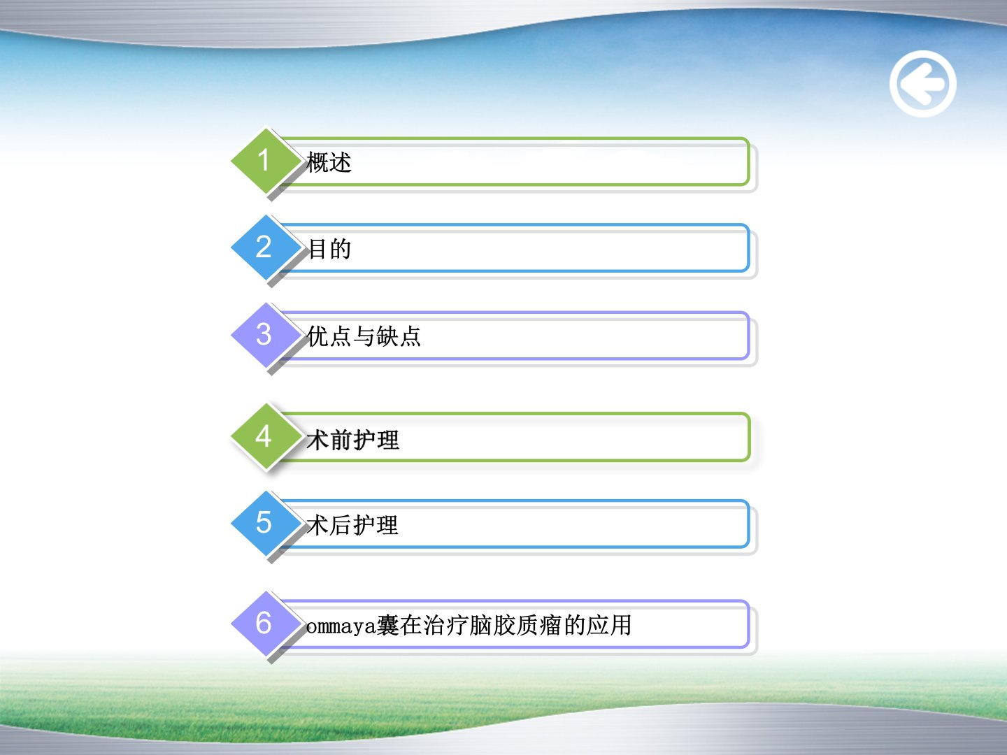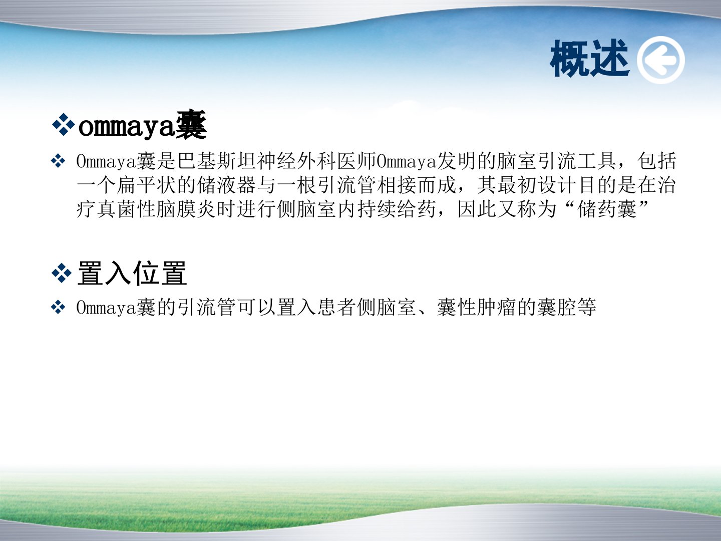 Ommaya囊是巴基斯坦神经外科医师Ommaya发明的脑室引流工具由扁平状储液器与引流管相接而成用于颅内局部持续给药可提高治疗效果及局部药物浓度。其优点包括创伤小、便捷、逆行感染几率低、留置时间长等;缺点为引流积血效果不如传统脑室引流快且价格较贵。术前需完善检查、局部备皮、确认无禁忌症;术后需严密观察患者意识、瞳孔及生命体征保持呼吸道通畅控制引流量和速度定时检查Ommaya囊位置。并发症包括颅内出血、感染、头皮排异、颅内积气等需针对原因进行预防和处理。此外Ommaya囊可应用于中枢神经系统肿瘤的治疗通过控释化疗向瘤腔内直接注射药物有效杀伤肿瘤细胞。化疗时需密切观察患者生命体征及不良反应。