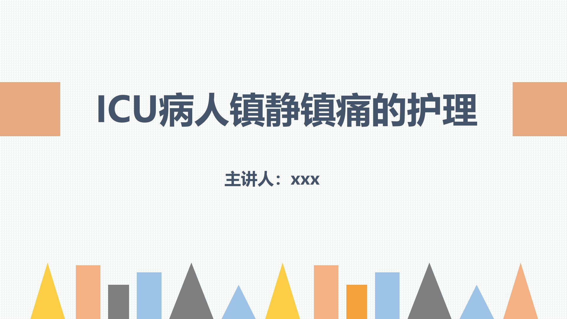 ICU病人镇静镇痛的护理摘要主讲人xxx围绕ICU病人镇静镇痛护理展开讲解。首先介绍了镇痛镇静的定义、目的与意义其旨在消除病人疼痛、减轻焦虑躁动、催眠并诱导遗忘减少不良刺激改善睡眠保护生命安全降低代谢速率等。接着阐述了临床指征包括疼痛、焦虑、躁动等以及常用药如苯二氮卓类、丙泊酚注射液等。同时强调常规监测如氧合、通气、循环、体温监测。在效果评价方面介绍了镇痛评估的VRS5量表和面部表情疼痛量表以及镇静评估的Ramsay标准评分和SAS评分。护理要点包括以病人主诉为标准评估去除诱因遵医嘱给药并调整剂量实施每日唤醒计划。并发症防护方面要注意呼吸抑制、低血压等情况。心理护理上要主动交流、介绍情况、鼓励患者、调整环境。最后强调国际上重视疼痛监测医护人员要仔细观察病情调节药物剂量减轻病人痛苦。