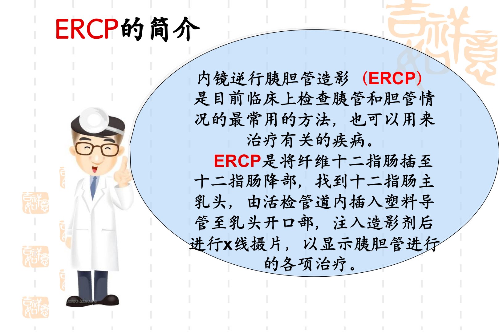 ERCP(内镜逆行胰胆管造影)是临床检查胰管和胆管及治疗相关疾病的常用方法。自1968年首次开展以来经不断改进我国ERCP成功率已达90左右成为胰胆疾病的重要诊断方法80年代起治疗性ERCP逐步成为某些胰胆疾病的重要治疗手段避免了部分患者手术痛苦取得满意疗效。ERCP适应症广泛包括疑有胆胰疾病、胆囊切除或胆管手术后症状复发、临床疑有胰腺肿瘤等情况;禁忌症包括上消化道狭窄、心肺功能不全、非结石嵌顿性急性胰腺炎等。术前需充分评估病情做好心理护理和病人准备包括禁饮禁食、查血、碘过敏实验等。术后需卧床休息、禁食24h并观察并发症如急性胰腺炎、胆道感染、消化道出血、穿孔等一旦发生需及时采取相应治疗措施。