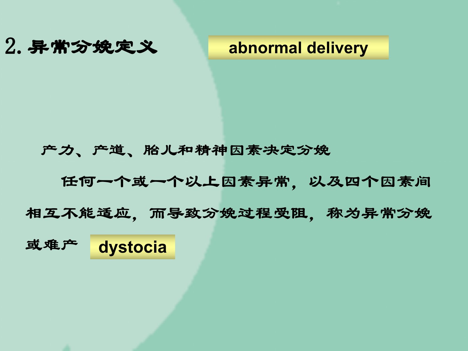 异常分娩诊治要点胎儿产道精神心理因素产力1.分娩四因素一、概述产力、产道、胎儿和精神因素决定分娩任何一个或一个以上因素异常,以及四个因素间相互不能适应,而导致分娩过程受阻,称为异常分娩或难产2.异常分娩定义abnormaldeliverydystocia3.异常分娩的分类分类Abnormaluterineaction子宫收缩的节律性、对称性及极性不正常或强度、频率有改变,称为子宫收缩力异常,简称产力异常定义二、产力异常产力异常收缩乏力收缩过强协调性(低张性)不协调性(高涨性)原发性继发性协调性不协调性急产(无阻力时)病理缩复环(有阻力时)强直性子宫收缩子宫痉挛性狭窄环分类产力异常(一)宫缩乏力...