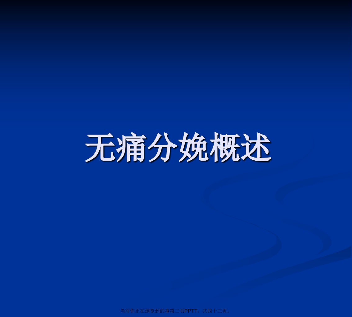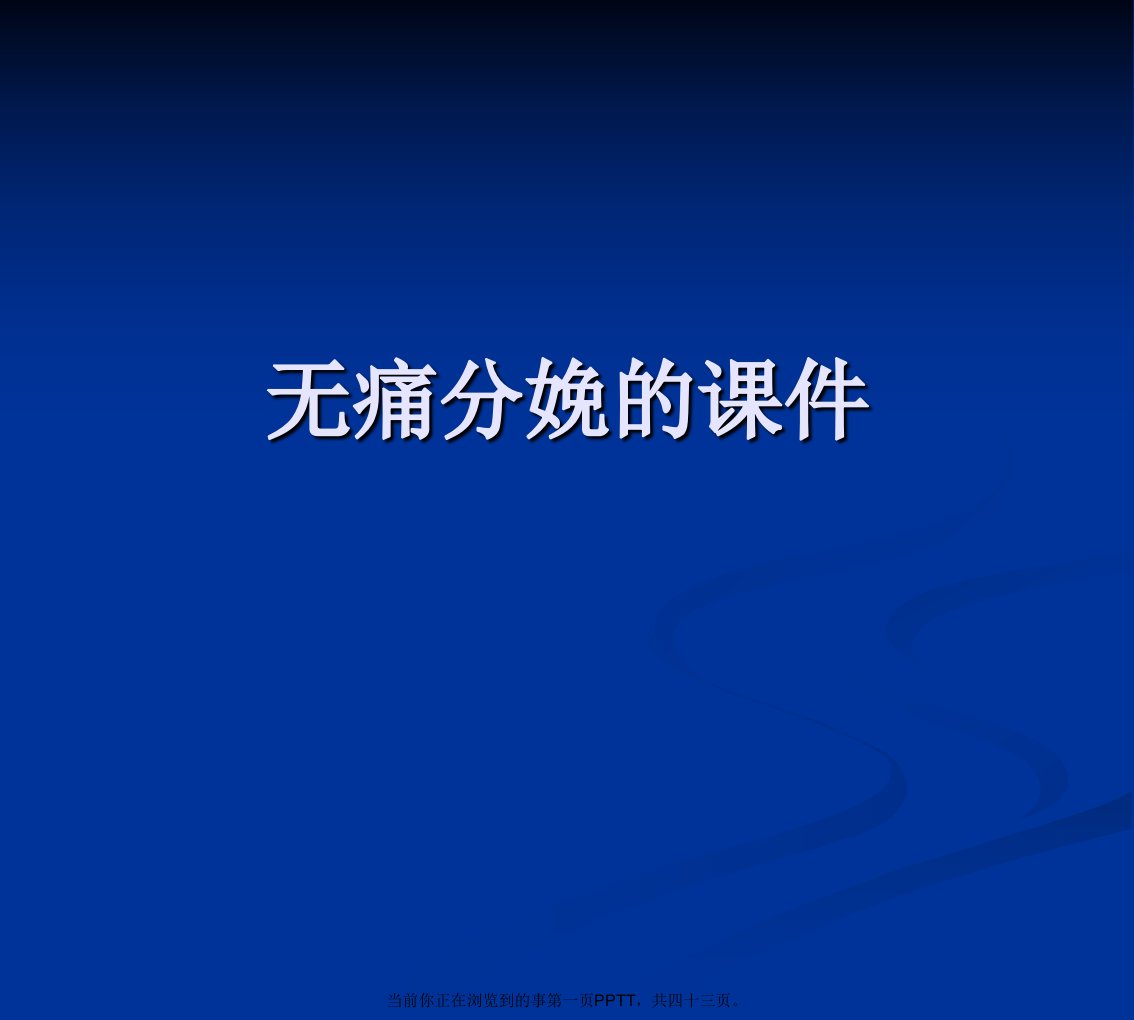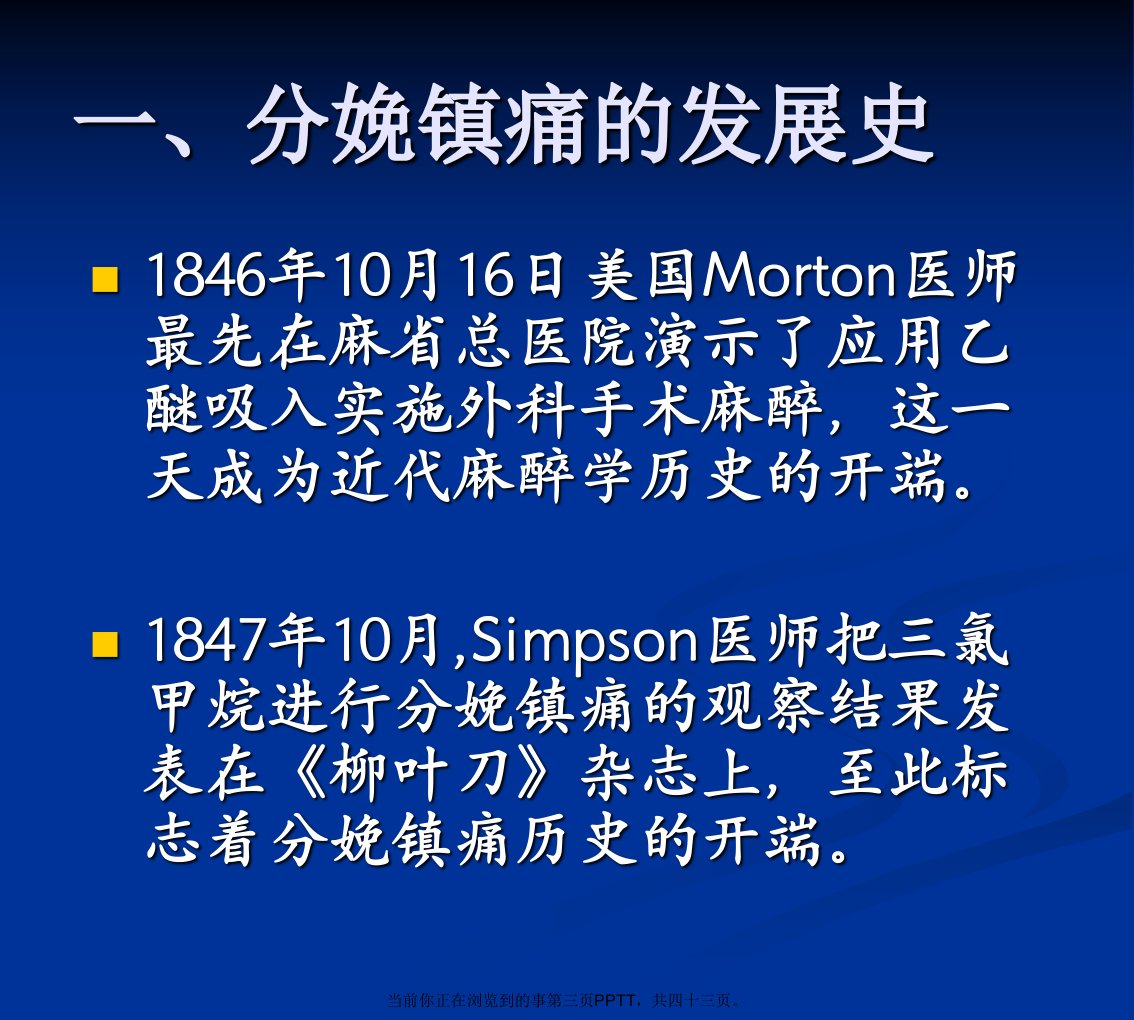 无痛分娩课件共43页首先介绍了无痛分娩的起源1846年Morton医师演示乙醚吸入麻醉次年Simpson医师发表三氯甲烷分娩镇痛观察结果标志着分娩镇痛历史的开端。1938年美国首次行腰部硬膜外阻滞完成分娩镇痛推动了该技术的发展。国内外分娩镇痛开展情况不同美国以单纯硬膜外镇痛为主英国分娩镇痛率达98而中国分娩镇痛率不足1剖宫产率却高达50。分娩时50的产妇感到剧烈疼痛20甚至“痛不欲生”。疼痛主要来自子宫收缩及宫颈扩张影响疼痛的因素包括身体、心理等。分娩镇痛可减少应激反应降低心输出量增加和血压升高真正提高母婴健康和安全是社会文明程度的标志之一。课件还详细介绍了分娩镇痛的适应症、非药物性和药物性镇痛方法其中硬膜外麻醉为“无痛分娩”主要手段镇痛有效率达95以上具有提高产妇自控能力和自信心等多种优点但要求具备熟练的操作技术可能引起低血压、头晕满意率及镇痛效果有时欠佳。最后课件指出剖宫产率高居不下主要因孕妇恐惧分娩疼痛可通过产前教育降低非医学指征的剖宫产率。