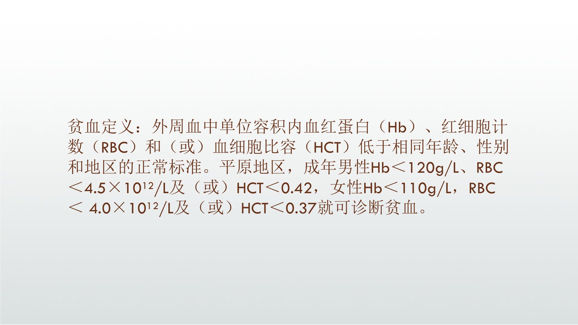 妊娠期贫血摘要贫血指外周血中单位容积内血红蛋白、红细胞计数和(或)血细胞比容低于正常标准。妊娠期贫血WHO标准为孕妇外周血Hb