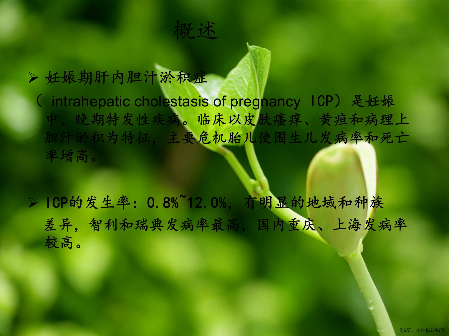 《妊娠期肝内胆汁淤积症》摘要妊娠期肝内胆汁淤积症(ICP)是妊娠中、晚期特发性疾病以皮肤瘙痒、黄疸和胆汁淤积为特征有地域和种族差异国内重庆、上海发病率较高。其病因包括:1雌激素作用使胆酸代谢障碍、胆汁流出受阻、胆汁回流增加;2遗传与环境因素有家族史者发病率高冬季高于夏季;3药物因素肾移植后服用硫唑嘌呤时易发生。ICP以皮肤瘙痒为首发症状四肢可见抓痕部分有黄疸且与胎儿预后密切相关。该病会增加产后出血率导致流产、早产增加胎儿窘迫、死胎等风险。诊断包括血清胆酸测定、肝功能测定、产后胎盘病理检查。一般处理需适当休息、吸氧等。药物治疗首选S腺苷蛋氨酸还有多烯磷脂酰胆碱、熊去氧胆酸等。研究表明思美泰联合易善复治疗比优思弗联合消胆胺治疗更能改善ICP的生化指标和妊娠结局。产科处理包括产前监护和适时终止妊娠。护理需注意胎心变化、教会孕妇自我监护、介绍疾病相关知识等。