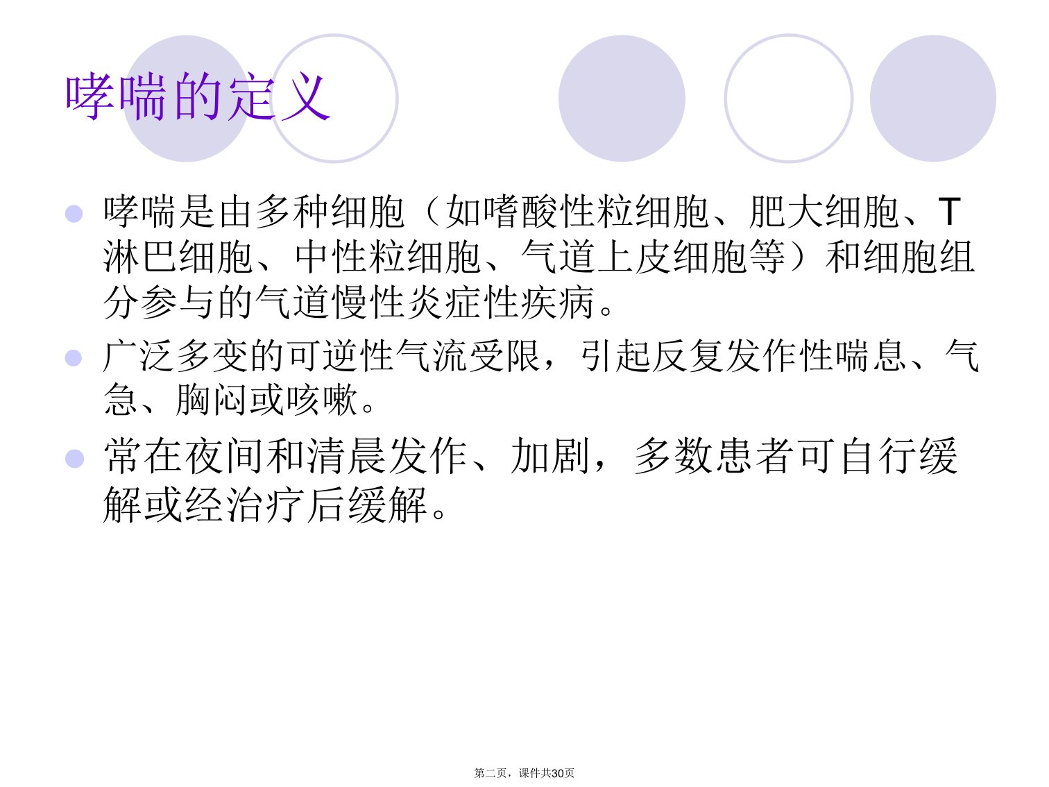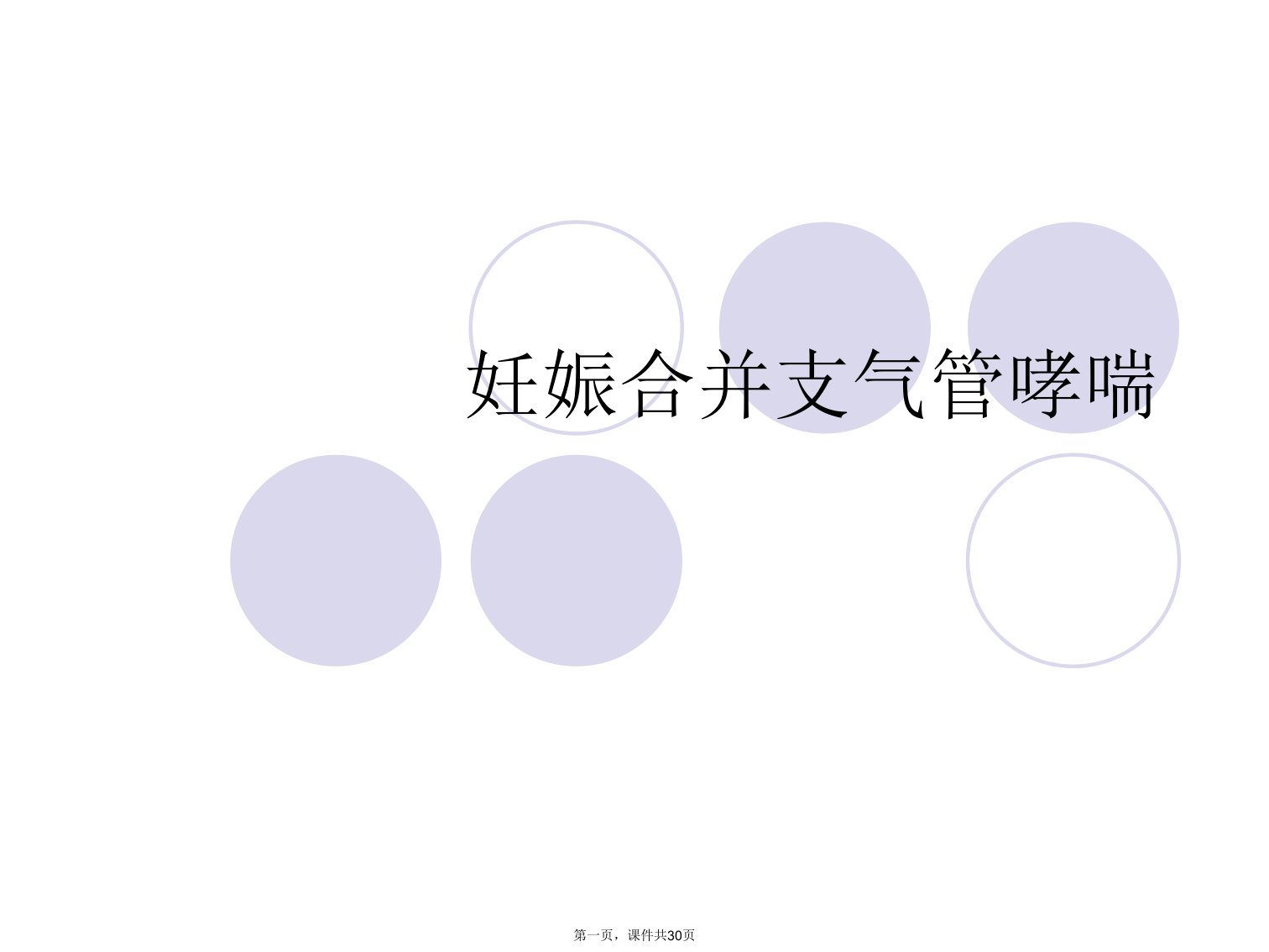 妊娠合并支气管哮喘第一页,课件共30页哮喘的定义哮喘是由多种细胞(如嗜酸性粒细胞、肥大细胞、T淋巴细胞、中性粒细胞、气道上皮细胞等)和细胞组分参与的气道慢性炎症性疾病。广泛多变的可逆性气流受限,引起反复发作性喘息、气急、胸闷或咳嗽。常在夜间和清晨发作、加剧,多数患者可自行缓解或经治疗后缓解。第二页,课件共30页哮喘的诊断标准1.反复发作喘息、气急、胸闷或咳嗽,多与接触变应原、冷空气、物理、化学性刺激以及病毒性上呼吸道感染、运动等有关。2.发作时在双肺可闻及散在或弥漫性,以呼气相为主的哮鸣音,呼气相延长。3.上述症状和体征可经治疗缓解或自行缓解。4.除外其他疾病所引起的喘息、气急、胸闷和咳嗽。5...