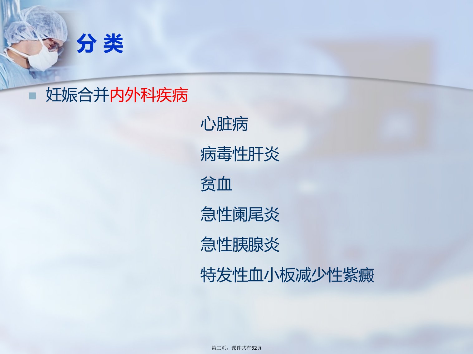 妊娠合并症护理第一页,课件共有52页概念妊娠合并症在未孕之前或妊娠期间发生的非妊娠直接引起的疾病,又称妊娠加杂症妊娠终止,疾病也不一定随之消失常见的影响较大的妊娠合并症有心脏病、慢性高血压病、糖尿病、肝炎、贫血等第二页,课件共有52页分类妊娠合并内外科疾病心脏病病毒性肝炎贫血急性阑尾炎急性胰腺炎特发性血小板减少性紫癜第三页,课件共有52页分类妊娠合并感染性疾病淋病梅毒尖锐湿疣生殖器疱疹支原体感染沙眼衣原体感染获得性免疫缺陷综合症AIDS第四页,课件共有52页妊娠合并心脏病护理妊娠合并心脏病是孕产妇死亡的重要原因之一,在我国孕产妇死因顺位中高居第二,占非直接死亡的首位第五页,课件共有52页妊娠合...