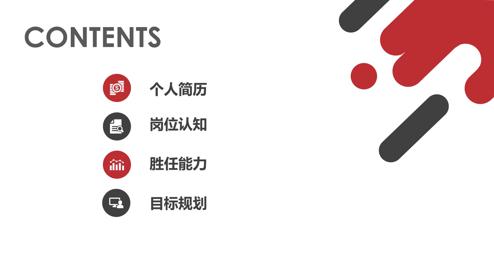 竞聘简历PPT摘要一、个人简历本PPT包含个人基本信息、个人经历、项目经历及成果展示了求职者丰富的职业背景。荣誉奖项部分列举了2014至2019年间获得的杰出贡献员工、卓越贡献奖、明星项目奖、个人业绩突出奖及最佳策划师等称号彰显了其卓越的工作表现。二、岗位认知对岗位有深刻理解强调需具备良好心态、全面知识结构、专业知识技能及人文素质修养。同时需有持之以恒的毅力、人力资源管理意识并具备发现问题、分析问题、解决问题的能力以及良好的总结思考与分析能力。三、胜任能力核心竞争力在于领导力与执行力。领导力强调从经验中学习、沟通倾听、果断决策等以身作则尤为关键。执行力则是项目成败的直接因素需有效战略与严密制度推动。此外还需具备技能进修、消化技能、总结经验及结合实践的专业技能与协调技能。四、目标规划详细规划了年度工作目标包括多个方面的具体任务旨在实现个人与团队的共同成长与发展。