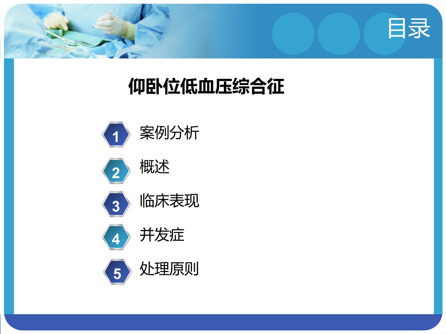 仰卧位低血压综合征指妊娠晚期孕妇仰卧时出现头晕、恶心、呕吐、胸闷等症状伴血压下降转为侧卧位后症状减轻或消失严重者可危及母儿生命。孕妇张XX29岁孕2产0停经36周5天因血糖升高3月、阴道见红半天入院。入院后胎心监护提示类胎监决定再次入院观察。入院后患者各项指标正常但在胎心监护过程中平卧几分钟后出现心慌症状考虑为仰卧位低血压综合征医生嘱其摇高床头、左侧卧位、吸氧并继续监测同时快速补液。后患者症状迅速缓解诊断为仰卧位低血压综合征。该综合征发病时间在仰卧310分钟后体征包括面色苍白青紫、血压下降等。并发症有胎儿缺氧、胎盘早剥、输尿管受压尿量减少等。常规建议孕妇睡姿为左侧卧位以预防此综合征。