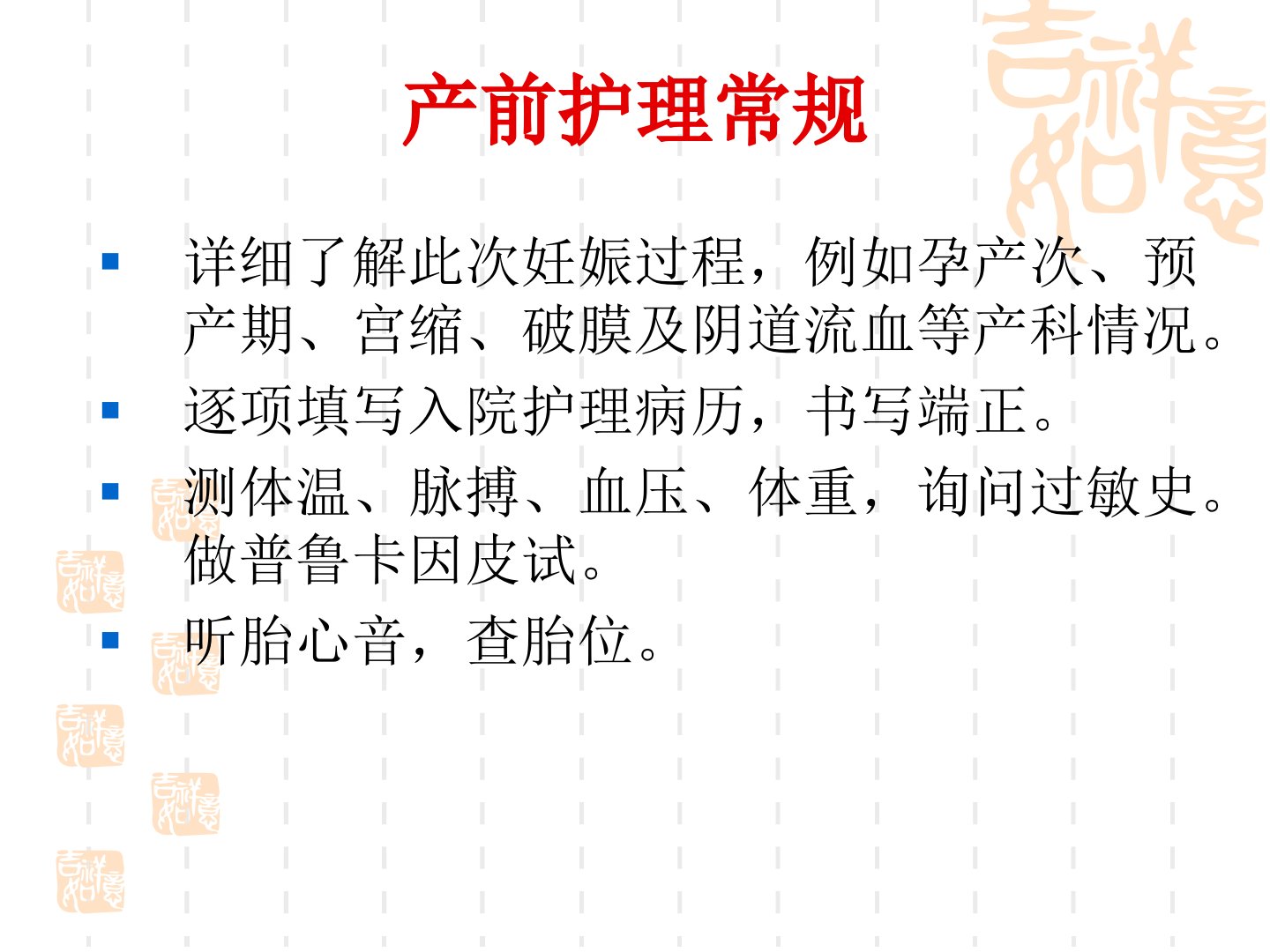 产科一般护理常规产VIP2产前护理常规详细了解此次妊娠过程,例如孕产次、预产期、宫缩、破膜及阴道流血等产科情况。逐项填写入院护理病历,书写端正。测体温、脉搏、血压、体重,询问过敏史。做普鲁卡因皮试。听胎心音,查胎位。产前护理常规外阴备皮(原则上孕37周以后,包括孕37周),更换清洁衣裤。介绍入院须知,了解孕妇心理,做好心理护理。安排床位、饮食,通知医生。待产期间,注意观察胎心音、宫缩,一般若孕妇宫缩不紧,鼓励下床活动。产时护理常规第一产程护理自子宫有规律的宫缩开始,宫口逐渐扩张直至10cm称为第一产程。第一产程初产妇一般需12~16h,经产妇约6~8h。观察宫缩:正规宫缩开始时间、宫缩间歇和持...