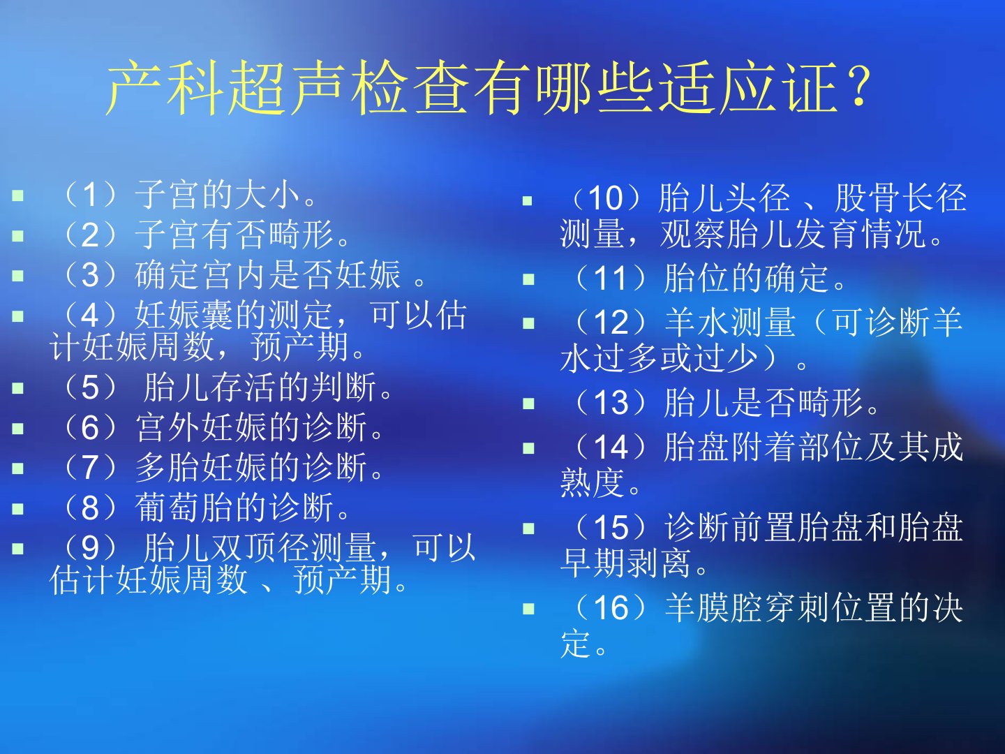 产科B超是评估妊娠状态的重要工具其检查内容涵盖:子宫大小与形态、宫内妊娠确认、妊娠囊测定以预估孕周与预产期、胎儿存活状态评估、宫外妊娠与多胎妊娠诊断、葡萄胎鉴别、胎儿发育指标(双顶径、头径、股骨长径)测量、胎位确定、羊水量评估(过多或过少)、胎儿畸形筛查、胎盘位置与成熟度分析、前置胎盘及胎盘早期剥离诊断以及羊膜腔穿刺定位。妊娠期分为早期(12周前)、中期(1327周)、晚期(2840周)三个阶段。早期妊娠时B超可识别子宫增大、妊娠囊形成、胚芽点状回声及原始心管搏动等特征并据此估算孕龄。中期妊娠可见完整胎儿形象及附属物晚期妊娠则能清晰显示胎儿骨骼系统、循环系统及内脏结构。孕龄判定可通过公式计算、估测法及查表法实现。胎位判定在妊娠32周后较为固定超声可及早发现臀位或横位以进行纠正。此外B超还可诊断流产先兆、难免流产、过期流产等异常妊娠情况并识别葡萄胎、胎儿脑积水、脊柱裂等胎儿畸形。