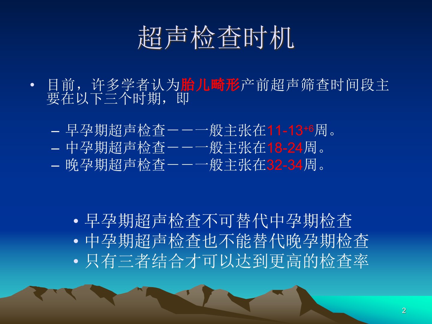 胎儿产前超声检查指标及其意义超声科超声检查时机目前,许多学者认为胎儿畸形产前超声筛查时间段主要在以下三个时期,即早孕期超声检查--一般主张在11-13+6周。中孕期超声检查--一般主张在18-24周。晚孕期超声检查--一般主张在32-34周。早孕期超声检查不可替代中孕期检查中孕期超声检查也不能替代晚孕期检查只有三者结合才可以达到更高的检查率早期妊娠超声检查目的1、确定宫内是否妊娠及胚胎是否存活。2、确定胚胎数目。3、估计妊娠龄。4、检测胎儿早期结构畸形。5、胎盘。6、子宫及附件。胎儿颈项透明层(NT)-胎儿颈后部皮下组织内液体积聚的厚度检查时间为11-13+6周。正常值<2.5mm。意义:NT...