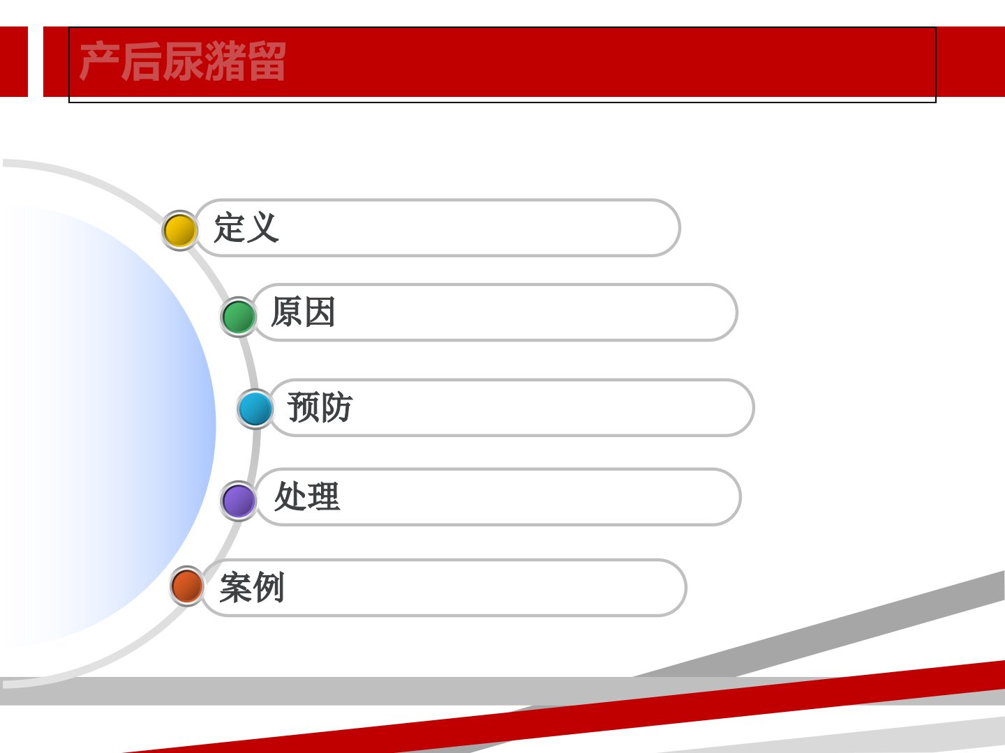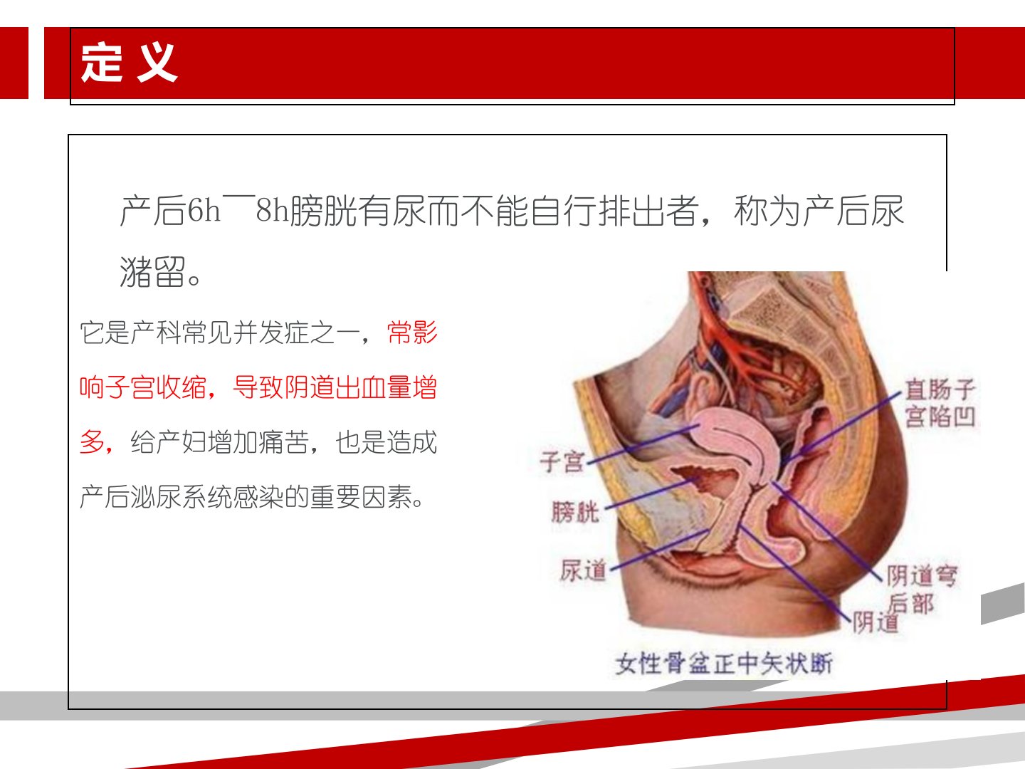 产后尿潴留产后尿潴留案例处理预防原因定义定义产后6h~8h膀胱有尿而不能自行排出者,称为产后尿潴留。它是产科常见并发症之一,常影响子宫收缩,导致阴道出血量增多,给产妇增加痛苦,也是造成产后泌尿系统感染的重要因素。发病原因产程延长由于第二产程延长,使原先受胎头先露压迫的膀胱三角区黏膜进一步充血、水肿,并发展到膀胱底部、尿道括约肌水肿、充血及会阴部肿胀,增加了产后尿潴留的机会。这说明第二产程延长的初产妇明显比经产妇易发生产后尿潴留。腹压下降产后腹压突然降低、腹壁松弛、膀胱容积突然增大。疼痛刺激产后会阴侧切或会阴撕裂造成外阴创伤疼痛,使支配膀胱的神经功能紊乱,反射性地引起膀胱括约肌痉挛而发生产后尿潴...