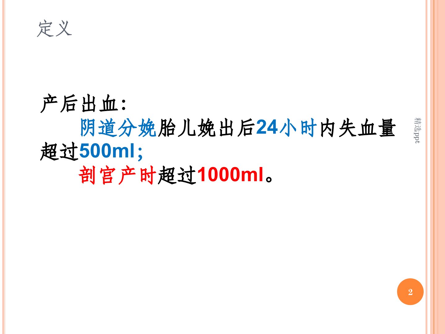 产后出血——产后出血量评估精选ppt摘要本文聚焦产后出血首先明确其定义:阴道分娩胎儿娩出后24小时内失血量超500ml剖宫产时超1000ml。接着介绍产后出血量评估方法:容积法通过接血容器收集血液后用量杯测量;面积法按接血纱布、产褥垫血湿面积粗略估计;称重法适用于显性出血患者依产垫、血垫重量变化评估;休克指数法适用于未收集失血量产妇及隐匿性产后出血。文中以30岁G1P0的王怡病例展开说明其G39周入院试产后胎儿娩出失血350ml胎盘娩出失血300ml因宫缩乏力、侧切口阴道壁深部延裂伴出血经报告上级、缝合伤口、加强宫缩、抗休克等处理后好转产后2小时估计出血量总计800ml。评估失血量需结合产前产后血常规红细胞压积、血红蛋白及红细胞综合评估才有参考价值。