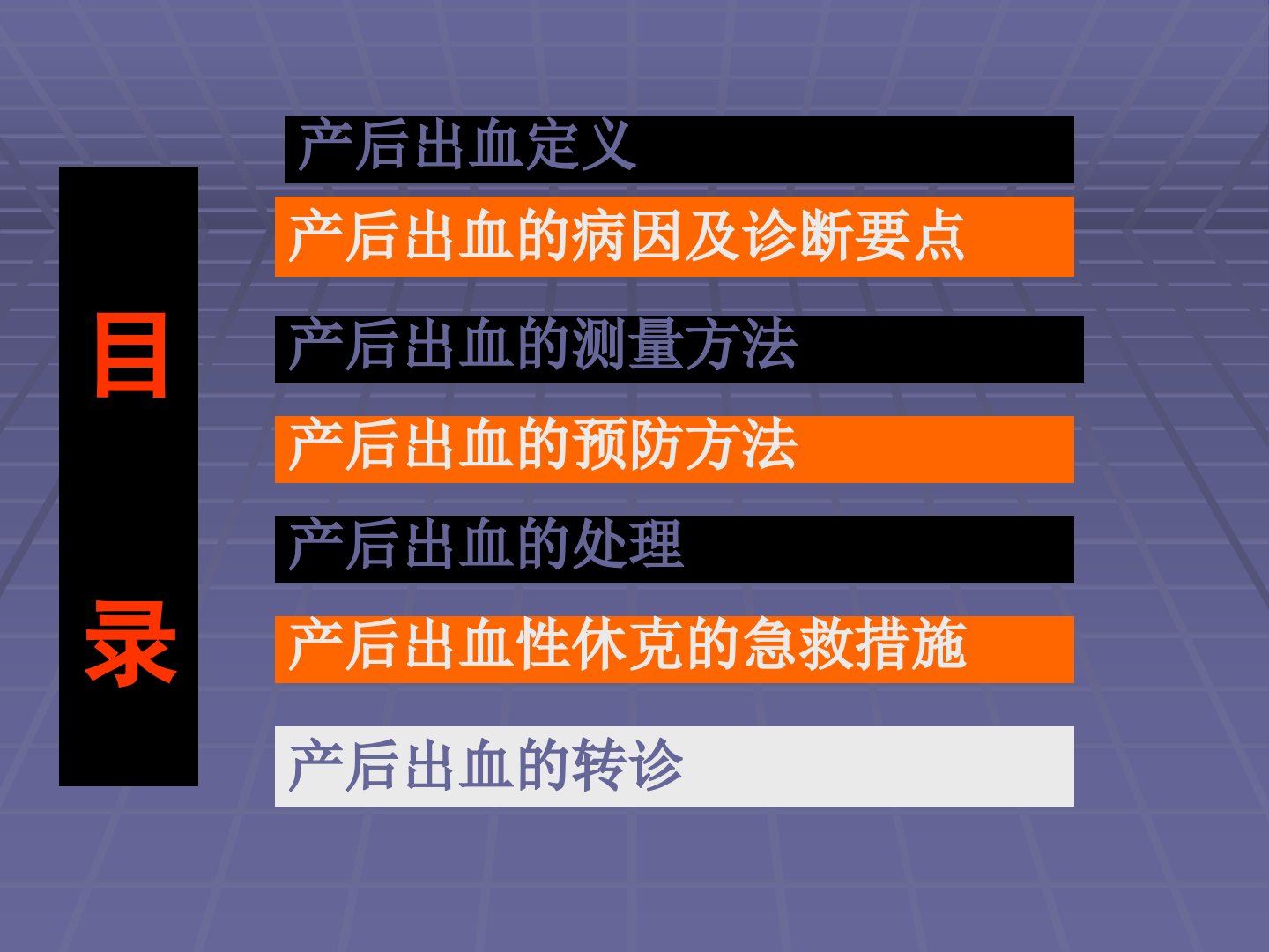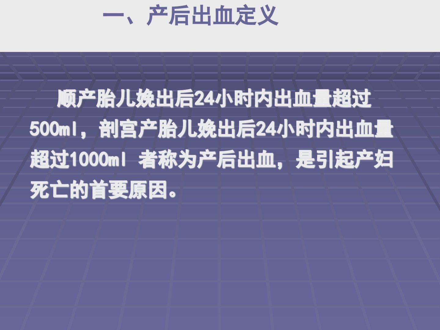 产后出血的诊断和处理目录产后出血定义产后出血的病因及诊断要点产后出血的测量方法产后出血的预防方法产后出血的处理产后出血性休克的急救措施产后出血的转诊顺产胎儿娩出后24小时内出血量超过500ml,剖宫产胎儿娩出后24小时内出血量超过1000ml者称为产后出血,是引起产妇死亡的首要原因。一、产后出血定义二、产后出血的病因及诊断要点(一)宫缩乏力:不能有效关闭胎盘附着部位的子宫血窦、血栓形成障碍而出血。 1.临床表现 (1)胎盘娩出后阴道出血阵发性增多,子宫轮廓不清、软,按压宫底有大量血块排出; (2)有时阴道出血不多,但血块大量积存于宫腔内,当产妇出现休克时已为时过晚。 2.影响子宫收缩的...