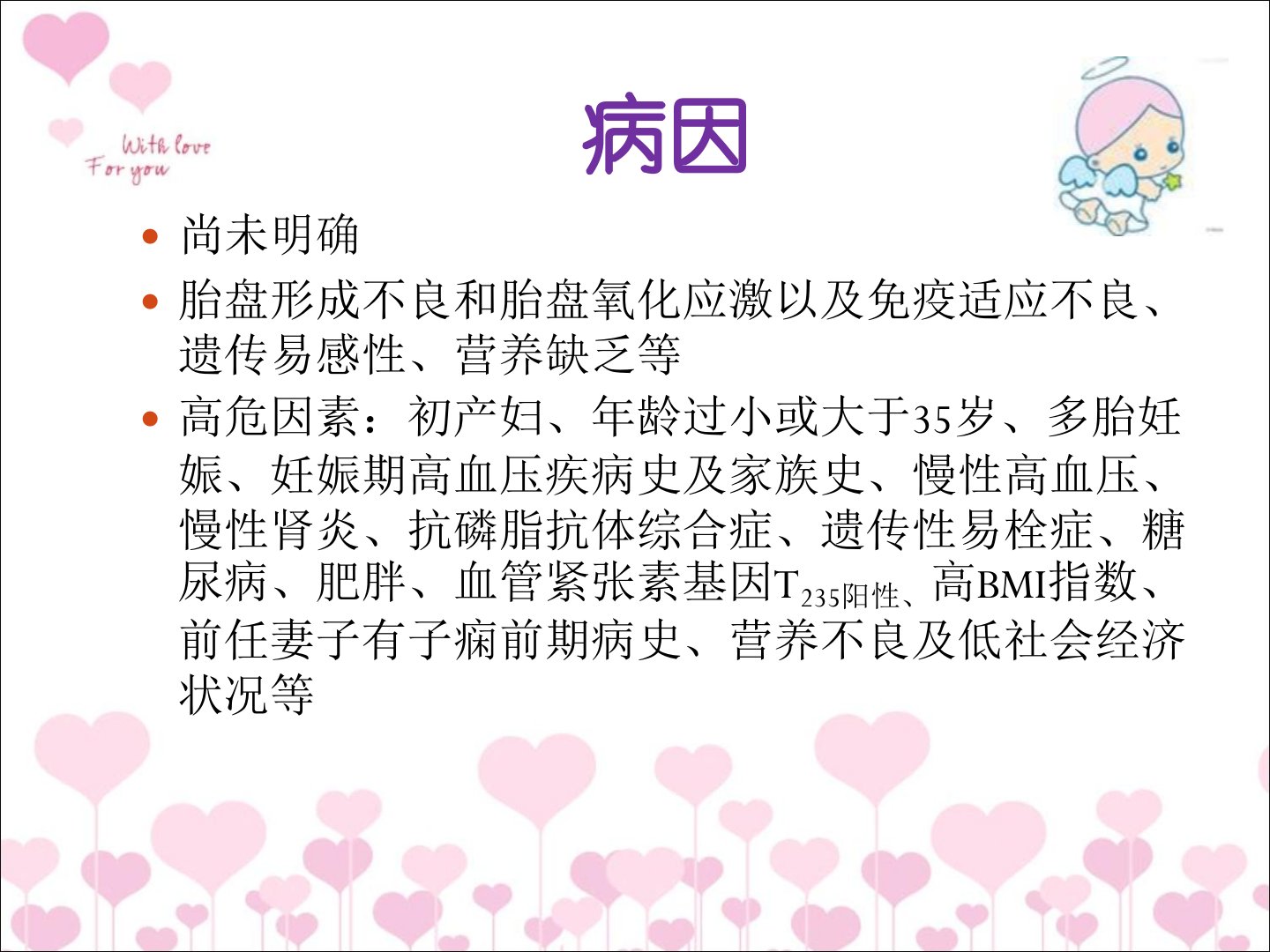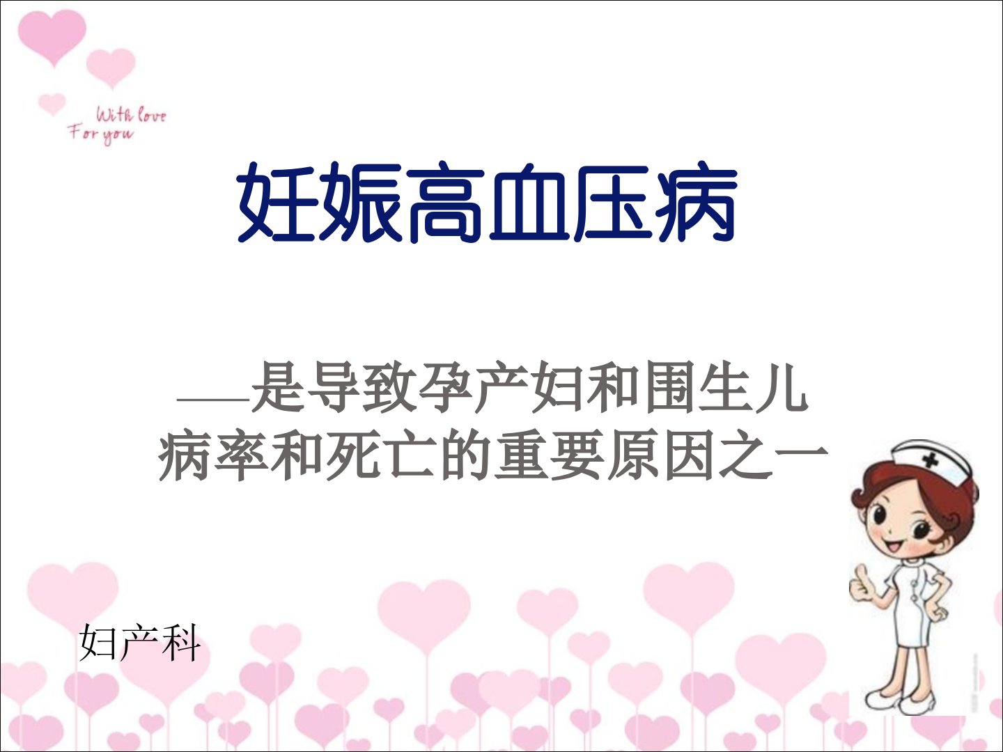 妊娠高血压病是导致孕产妇和围生儿病率和死亡的重要原因之一包括妊娠期高血压、子痫前期、子痫、慢性高血压并发子痫前期及妊娠合并慢性高血压多发生于妊娠20周后以高血压、蛋白尿为主要特征病因尚未明确。高危因素有初产妇、年龄过小或大于35岁、多胎妊娠、高血压疾病史及家族史、慢性高血压、糖尿病、肥胖等。其基本病理生理变化为全身小血管痉挛各系统脏器灌流减少出现脑、肾、肝、心脏、血管、血液、生殖系统等变化。子痫的临床表现包括高血压、蛋白尿、水肿等。治疗基本原则为镇静、解痉、降压、利尿、适时终止妊娠妊娠期高血压以一般治疗为主子痫前期和子痫需解痉降压必要时终止妊娠合并慢性高血压以降血压为主。预防需健全围生期保健自觉进行产前检查合理营养与休息补钙预防妊高征。