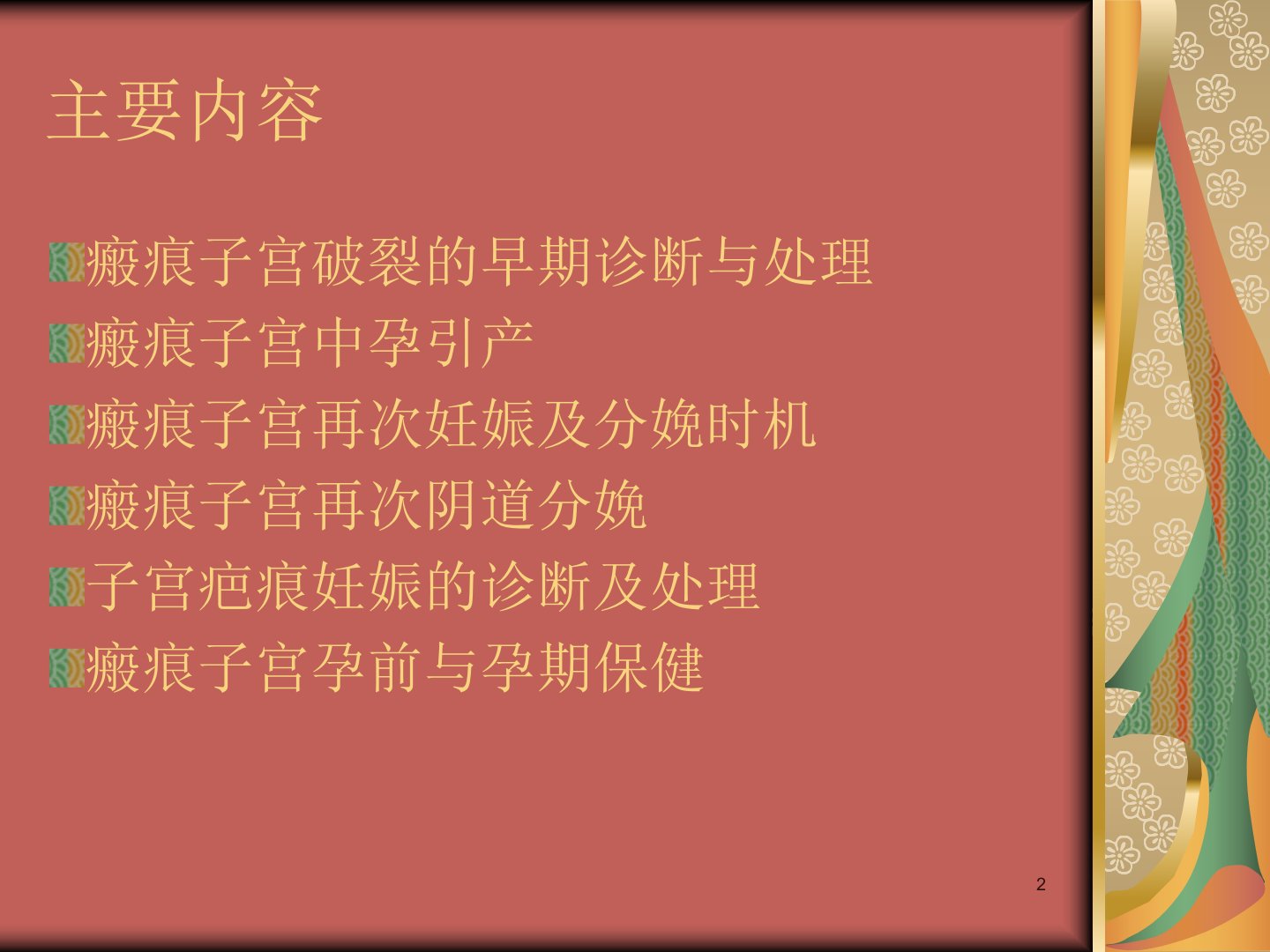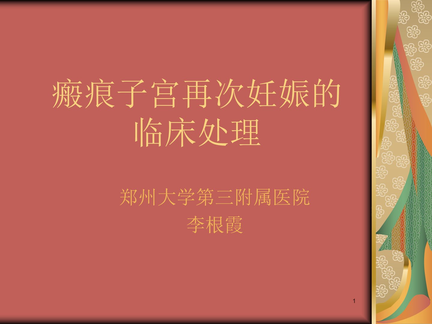 瘢痕子宫再次妊娠的临床处理摘要郑州大学第三附属医院的李根霞探讨了瘢痕子宫再次妊娠的临床处理问题。首先文章讨论了瘢痕子宫破裂的早期诊断与处理指出剖宫产术后再次妊娠子宫破裂发生率较高多发生于妊娠中晚期强调了病史、临床表现、腹部检查和辅助检查如超声、MRI在诊断中的作用并提出了相应的治疗方案。其次对于瘢痕子宫中孕引产文章指出虽然经典论著持审慎态度但国内外文献认为在严密观察下中孕引产的安全性较为肯定并探讨了多种引产方法。接着讨论了瘢痕子宫再次妊娠及分娩的时机指出子宫切口愈合需要时间再次妊娠应至少在术后2年。对于瘢痕子宫再次阴道分娩文章列举了适应症和禁忌症并强调了降低再次剖宫产率的措施。此外还介绍了子宫疤痕妊娠的定义、病因、辅助检查和治疗方法包括早孕期和中晚孕期的不同处理策略。最后强调了瘢痕子宫孕前与孕期的保健重要性包括妊娠早期的警惕、孕中晚期的系统超声检查等。