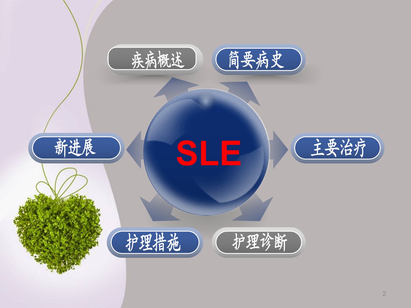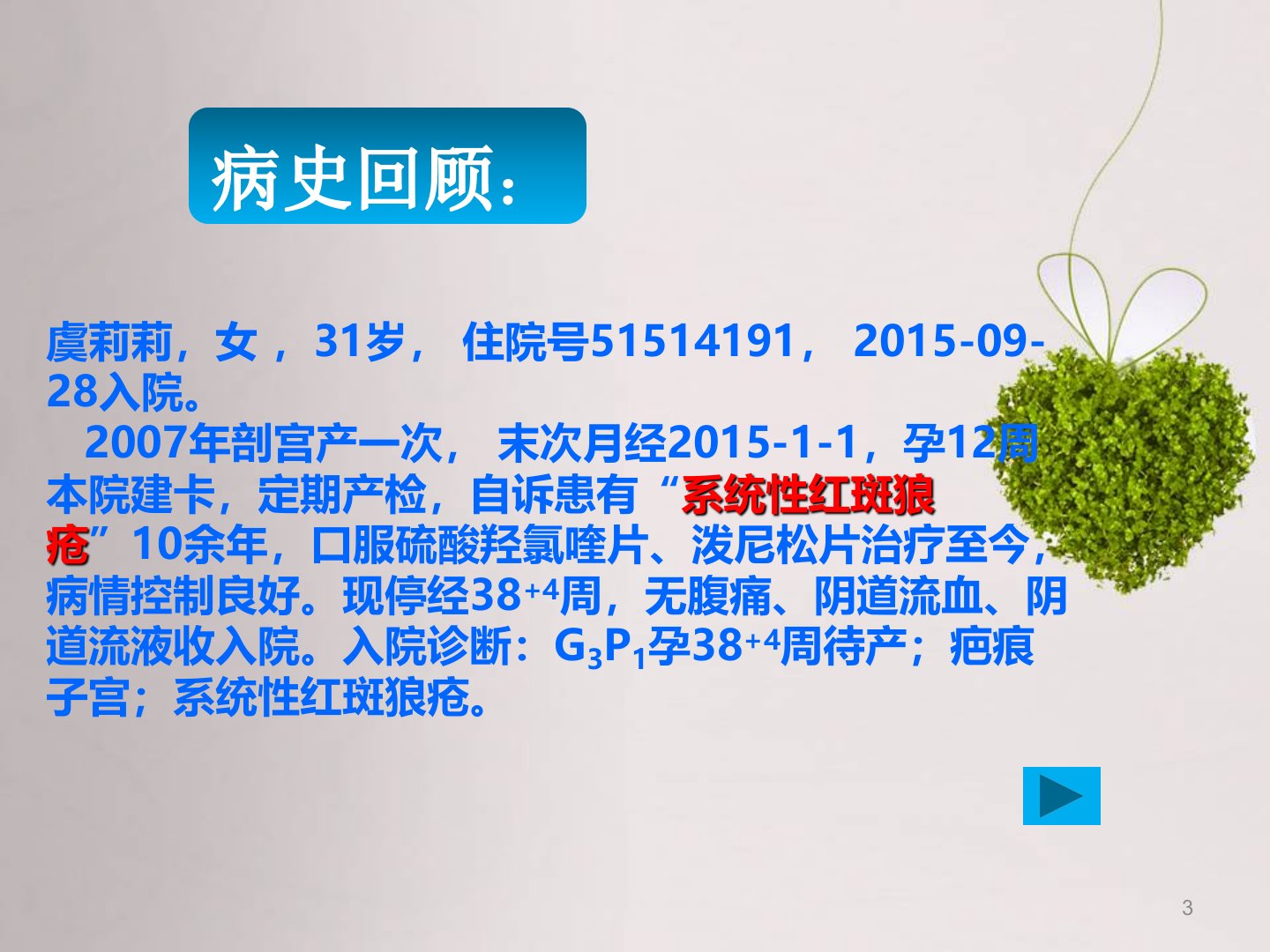 妊娠合并系统性红斑狼疮新进展护理措施护理诊断疾病概述简要病史主要治疗SLE虞莉莉,女,31岁,住院号51514191,2015-09-28入院。2007年剖宫产一次,末次月经2015-1-1,孕12周本院建卡,定期产检,自诉患有“系统性红斑狼疮”10余年,口服硫酸羟氯喹片、泼尼松片治疗至今,病情控制良好。现停经38+4周,无腹痛、阴道流血、阴道流液收入院。入院诊断:G3P1孕38+4周待产;疤痕子宫;系统性红斑狼疮。病史回顾:T:36.8℃P:100次/分R:19次/分Bp:124/86mmHg宫高/腹围:30/93胎方位ROA,浅入盆,胎心138次/分,规则,无宫缩。肛查:宫颈容受30%,宫...