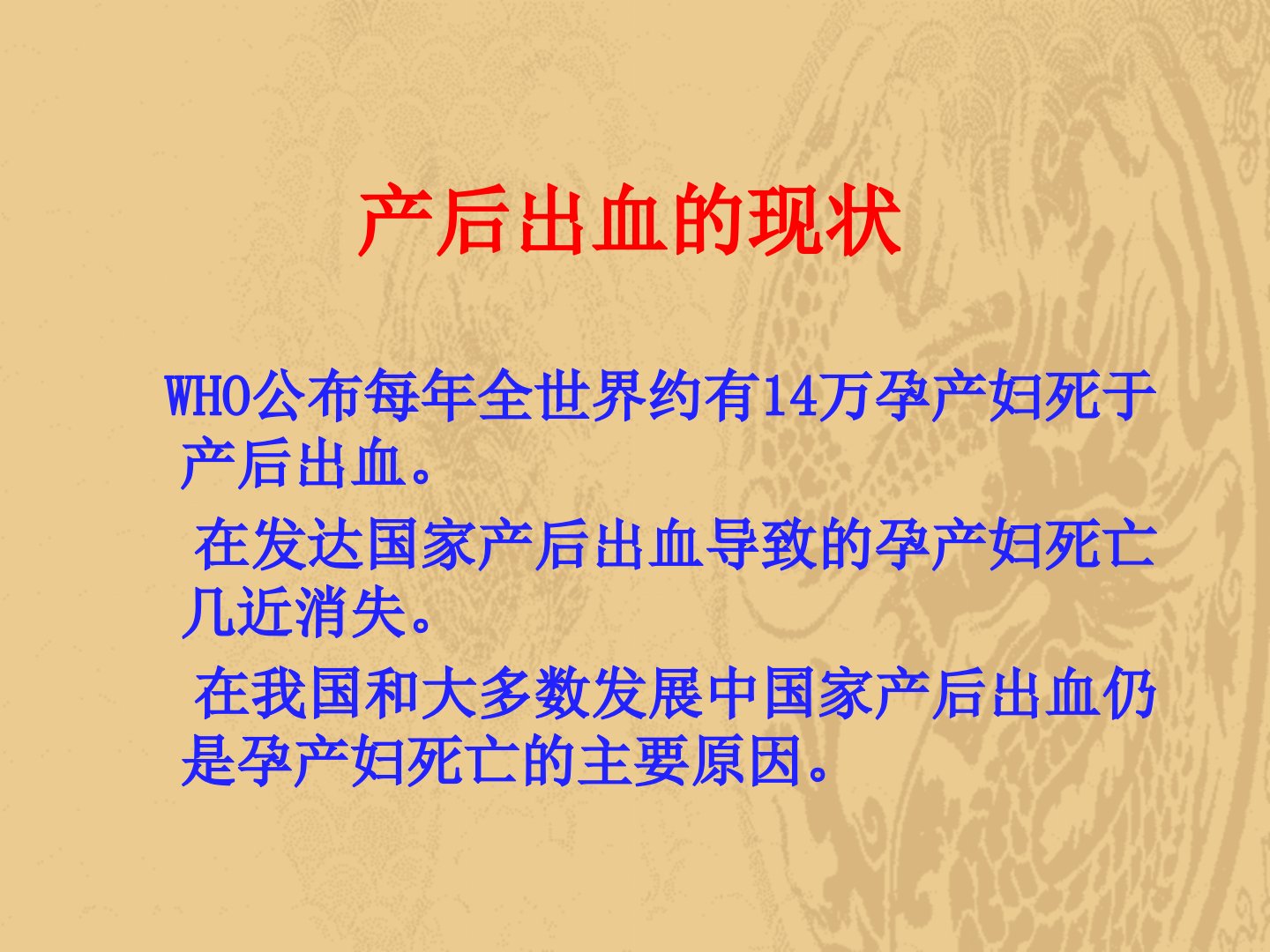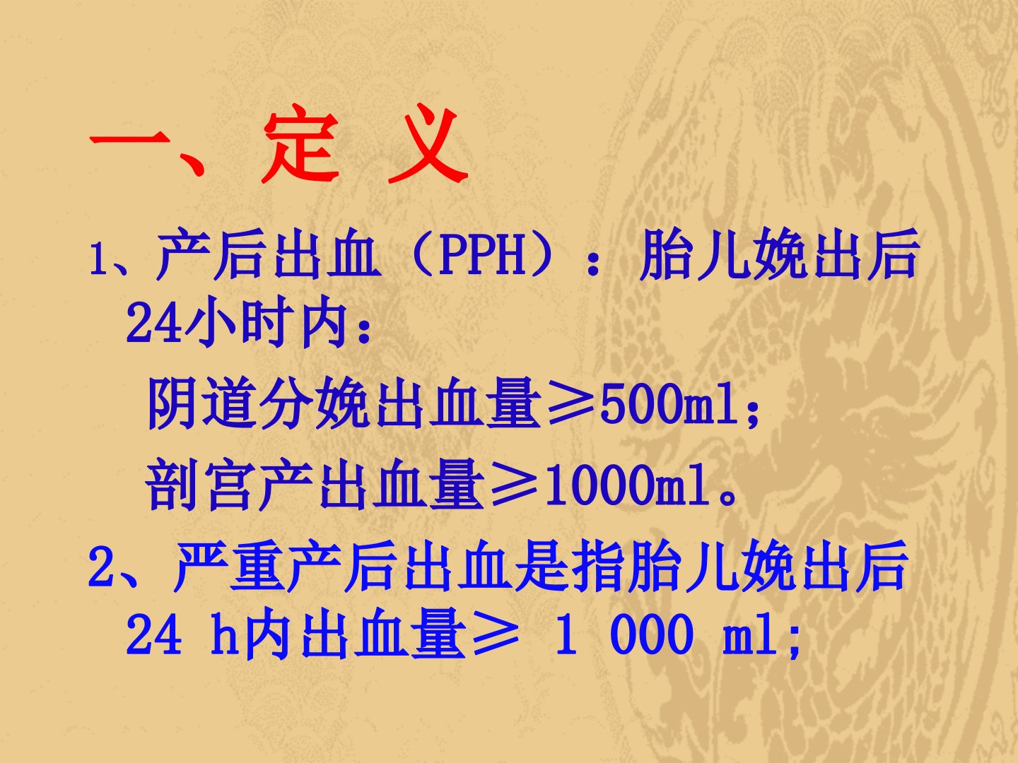 产后出血的现状、原因、表现、诊断、处理及预防WHO数据显示每年全球约14万孕产妇死于产后出血。发达国家此原因导致的死亡几近消失但在我国和发展中国家仍是孕产妇死亡主因不过多数死亡可避免关键在于早期诊断和正确处理。产后出血指胎儿娩出后24小时内阴道分娩出血量达500ml剖宫产出血量达1000ml;严重产后出血指24小时内出血量达1000ml。其病因包括子宫收缩乏力(70常见因素有全身、产科、子宫、药物因素等)、胎盘因素(10包括胎盘滞留、胎盘粘连植入、胎盘胎膜残留等)、软产道裂伤(20)和凝血功能障碍(1)。临床表现包括阴道流血和低血容量表现。诊断主要依据临床表现通过称重法、面积法、容积法等估测失血量。处理原则为针对原因止血、补充血容量、预防感染、纠正贫血。预防需加强产前保健、产时预防、产后预防。