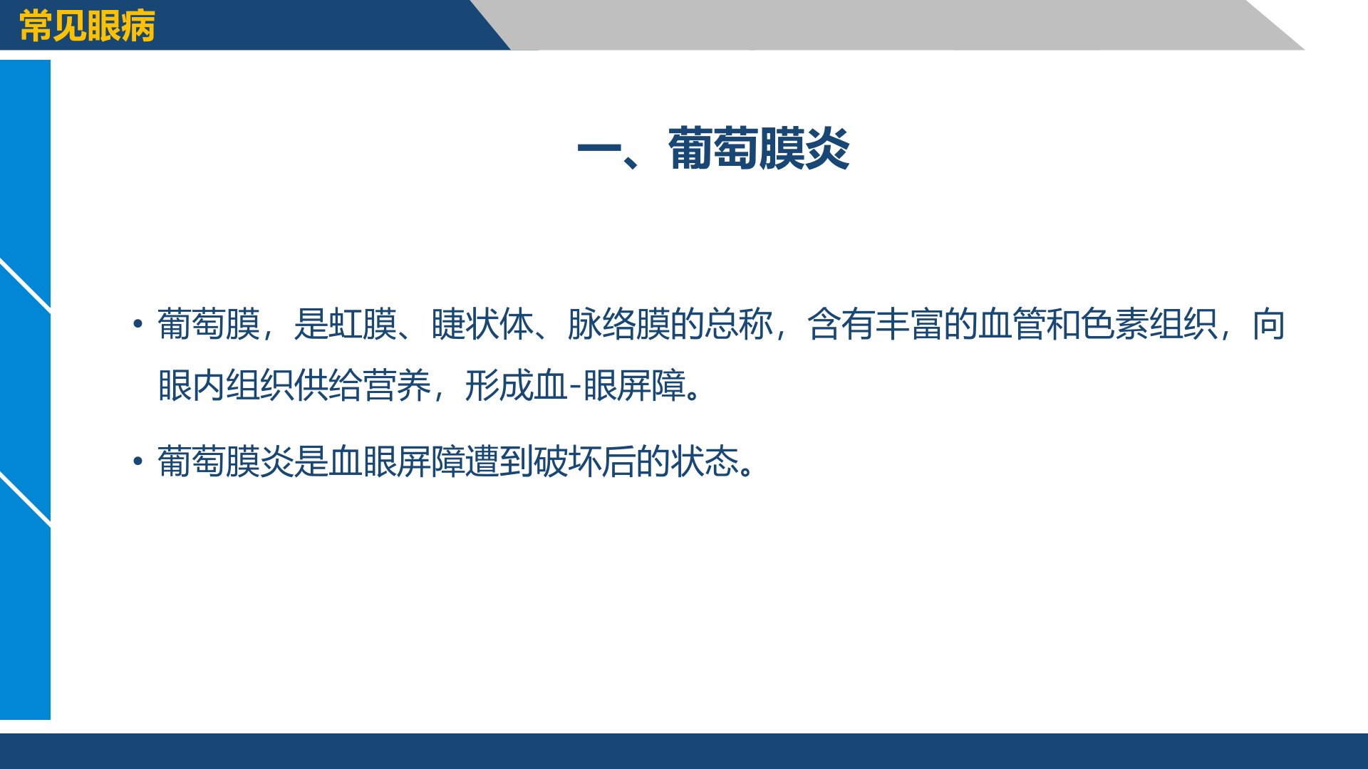 作为医生现将几种常见眼病摘要如下:1葡萄膜炎:病因包括感染和全身疾病。症状涵盖前房闪辉、角膜后沉积物等多种异常。诊断依赖裂隙灯、眼压等多项检查。治疗需查找并治疗原发病同时控制葡萄膜炎症。2结膜炎:由异物刺激、传染病继发、感染等引起。症状包括羞明、流泪、结膜充血肿胀等。诊断通过视诊和细胞诊断。治疗针对感染性结膜炎使用抗生素等药物非感染性结膜炎则针对病因治疗。3角膜炎:病因多样包括机械性损伤、传染病、免疫性反应等。症状以角膜混浊、缺损或溃疡等为特征。诊断采用荧光素钠染色和细胞学检查。治疗需找到原发病并治疗可使用滴眼液也可采取手术疗法。4白内障:病因分先天性和后天性。诊断包括彻照法、裂隙灯等多项检查。治疗一般采用手术方法如囊外摘除、囊内摘除、晶状体乳化白内障摘除术等。5晶体脱位:病因分为原发性和继发性。症状因半脱位和完全脱位而异。治疗针对有关眼病变给予药物治疗必要时实施晶状体囊内摘除术。6青光眼:病因分原发性、继发性和先天性。症状有急性与慢性之分。治疗原则是降低眼压和维护视觉功能包括高渗疗法、应用药物和手术疗法。7樱桃眼:指第三眼睑腺体肥大脱出。治疗包括瞬膜腺包埋手术和T型软骨切除术。