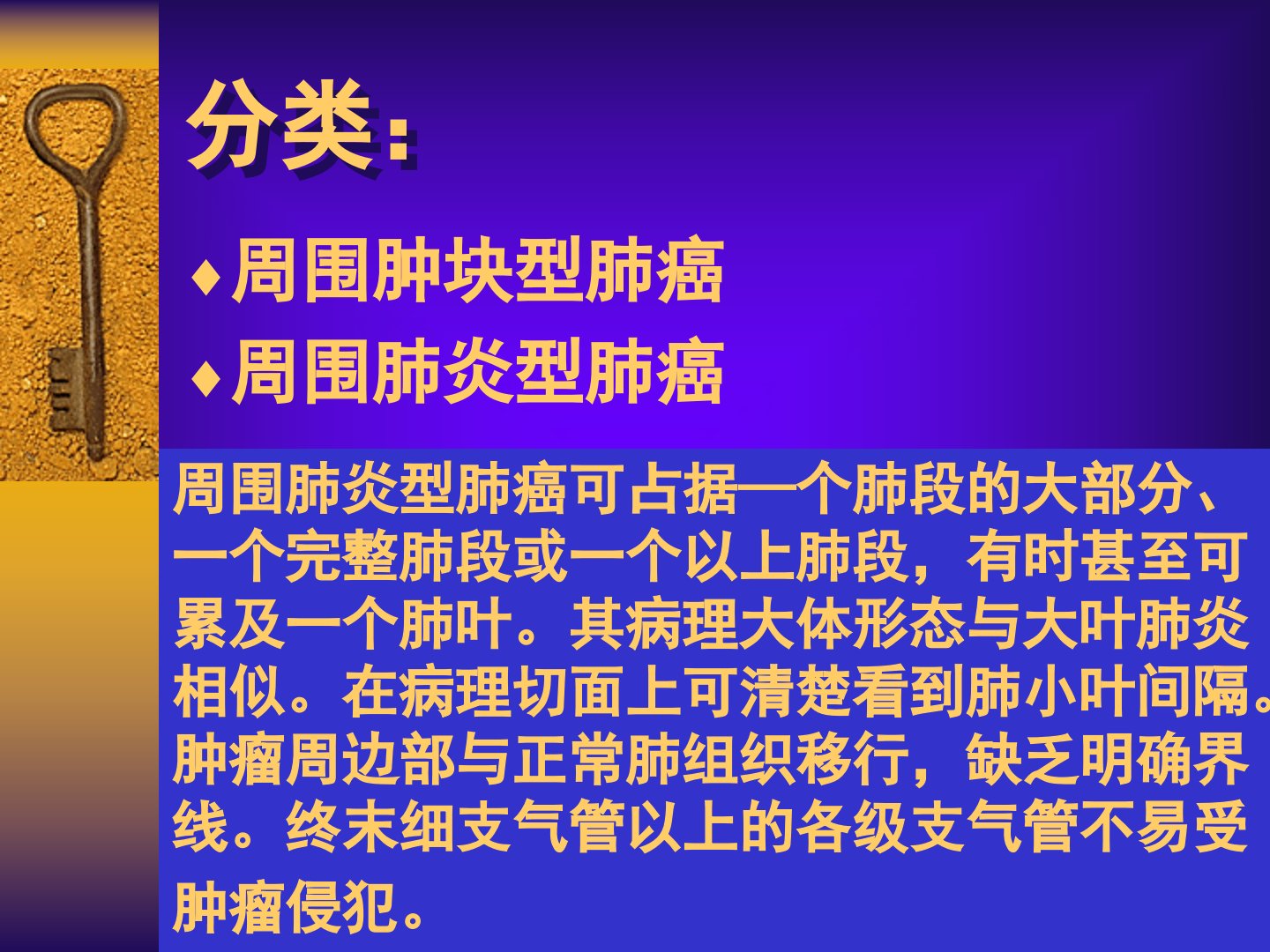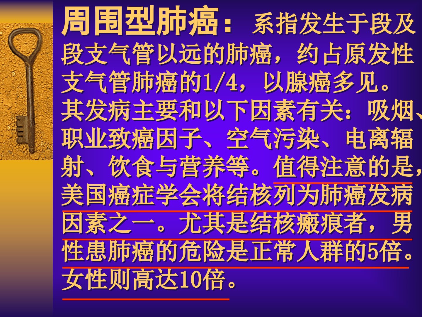 周围型肺癌CT征象分析摘要周围型肺癌发生于段及段支气管以远约占原发性支气管肺癌的14以腺癌多见。其发病与吸烟、职业致癌因子、空气污染等多种因素有关结核瘢痕者患肺癌风险显著增高。周围型肺癌分肿块型和肺炎型临床表现多样包括由原发肿瘤、局部扩展、远处转移引起的症状及肺外表现。CT检查能发现普通X线检查不能显示的解剖结构辨认肺门和纵隔淋巴结肿大显示肿瘤对邻近器官的侵犯利于胸内转移瘤的发现及鉴别诊断。CT表现上周围型肺癌以肺内孤立性肿块或结节为主早期肿瘤直径多在2cm以下进展期多在4cm以上。肿瘤肺交界带常见分叶征、毛刺征、棘突征等典型表现非典型表现为肿块近胸膜一侧的病灶边缘模糊。瘤体内部密度多均匀坏死时密度不均可形成空洞还有空泡征、支气管充气征等。邻近结构改变包括胸膜凹陷征、胸膜浸润、邻近血管及支气管聚拢等。增强CT表现有均匀强化、外周强化、不均匀强化等类型。