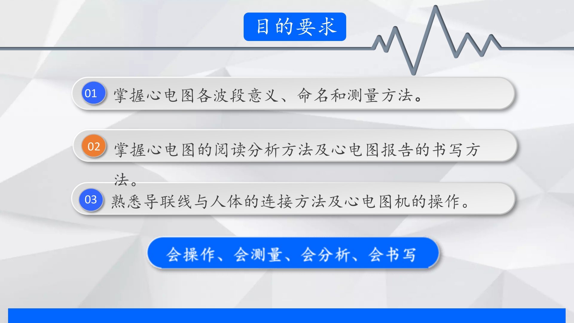 作为医生需掌握心电图阅读分析、报告书写及心电图机操作方法熟悉导联线连接。心电图通过标准12导联体系记录心脏电活动其中肢体导联反映心脏上下左右电活动胸前导联反映心脏前后左右电活动。心电图分析包括检查描记质量(伪差、电压)、定性(心律、电轴、转位、ST段及T波形态)和定量分析(各波段时间、振幅等)需从心律、传导、房室肥大、心肌问题四方面考虑并结合临床做出诊断。熟悉心电图正常变异如自主神经功能紊乱等。窦性心律特点为PQRST波规律出现P波在特定导联直立。平均心电轴测量有目测法和作图法电轴改变反映心脏病理变化。心脏循长轴转位分顺钟向和逆钟向提示心电位变化。心电图测量包括心率、各波段振幅和时间需注意测量方法和参考点选择。最后需准确填写心电图报告单详细描述P波、QRS波、ST段和T波特征。