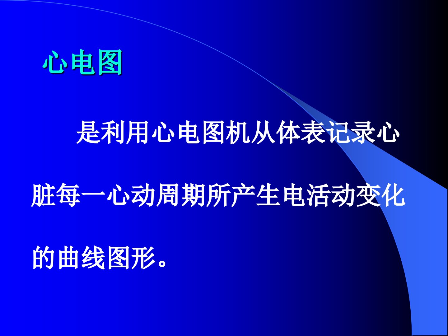 心电图(Electrocardiogram,ECG)第一节临床心电学基本知识一、心电图产生原理心电图是利用心电图机从体表记录心脏每一心动周期所产生电活动变化的曲线图形。心电图示例一、心肌细胞的电生理基础(一)极化状态(二)除极(三)复极心肌细胞复极过程心肌细胞的除极与复极心肌细胞的动作电位与心电图心室肌细胞动作电位与体表采集到的心肌电位强度的有关因素为:1、与心肌细胞数量(心肌厚度)呈正比关系;2、与探查电极位置和心肌细胞之间的距离,呈反比关系;3、与探查电极的方位和心肌除极的方向所构成的角度有关,夹角愈大,心电位在导联上的投影愈小,电位愈弱。Cardiacvector心脏特殊传导系统示意图(...