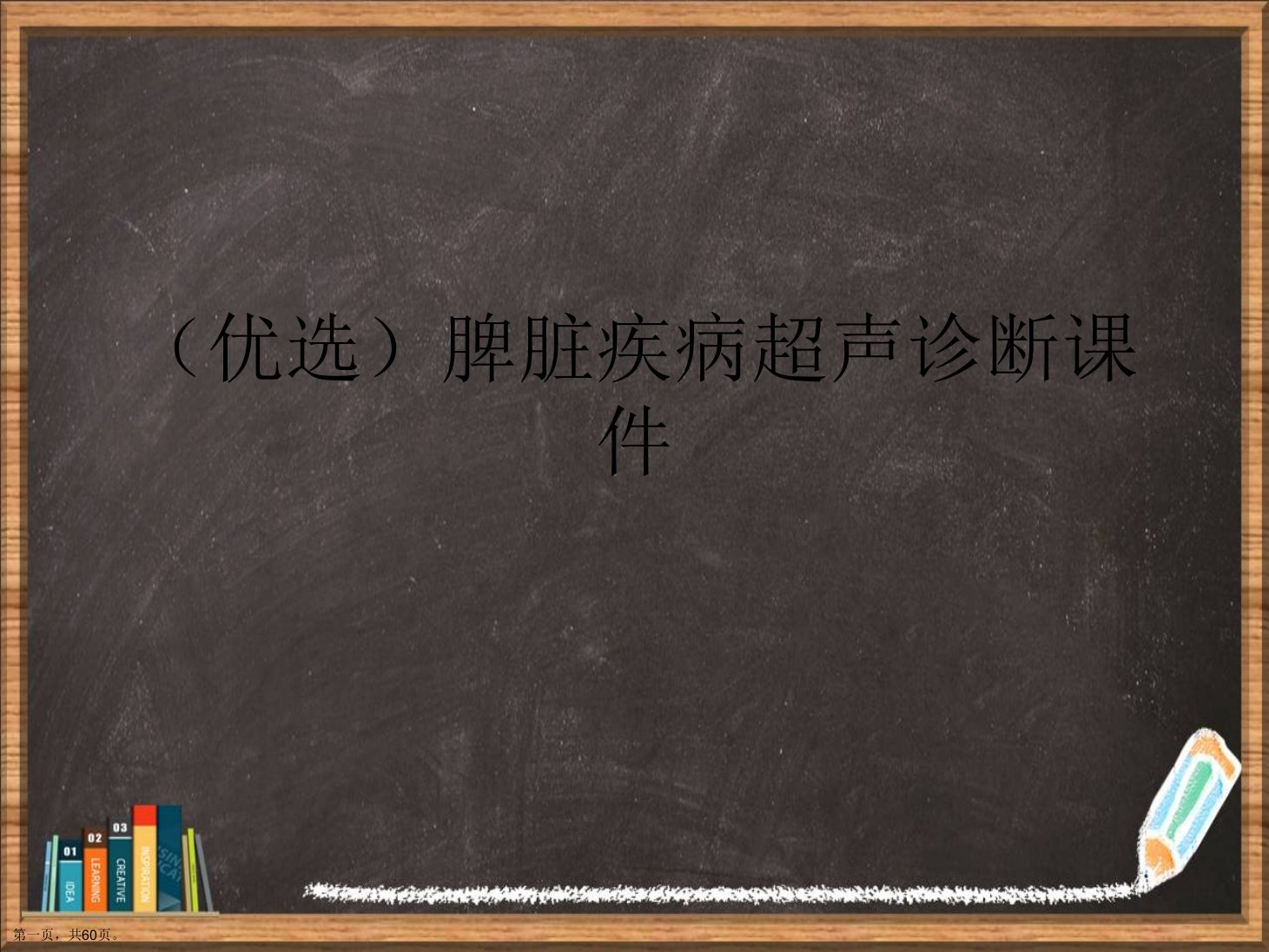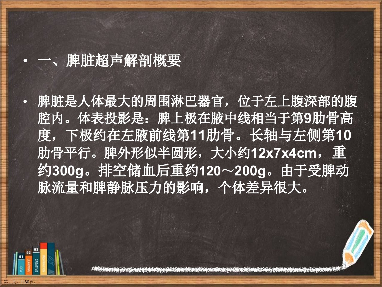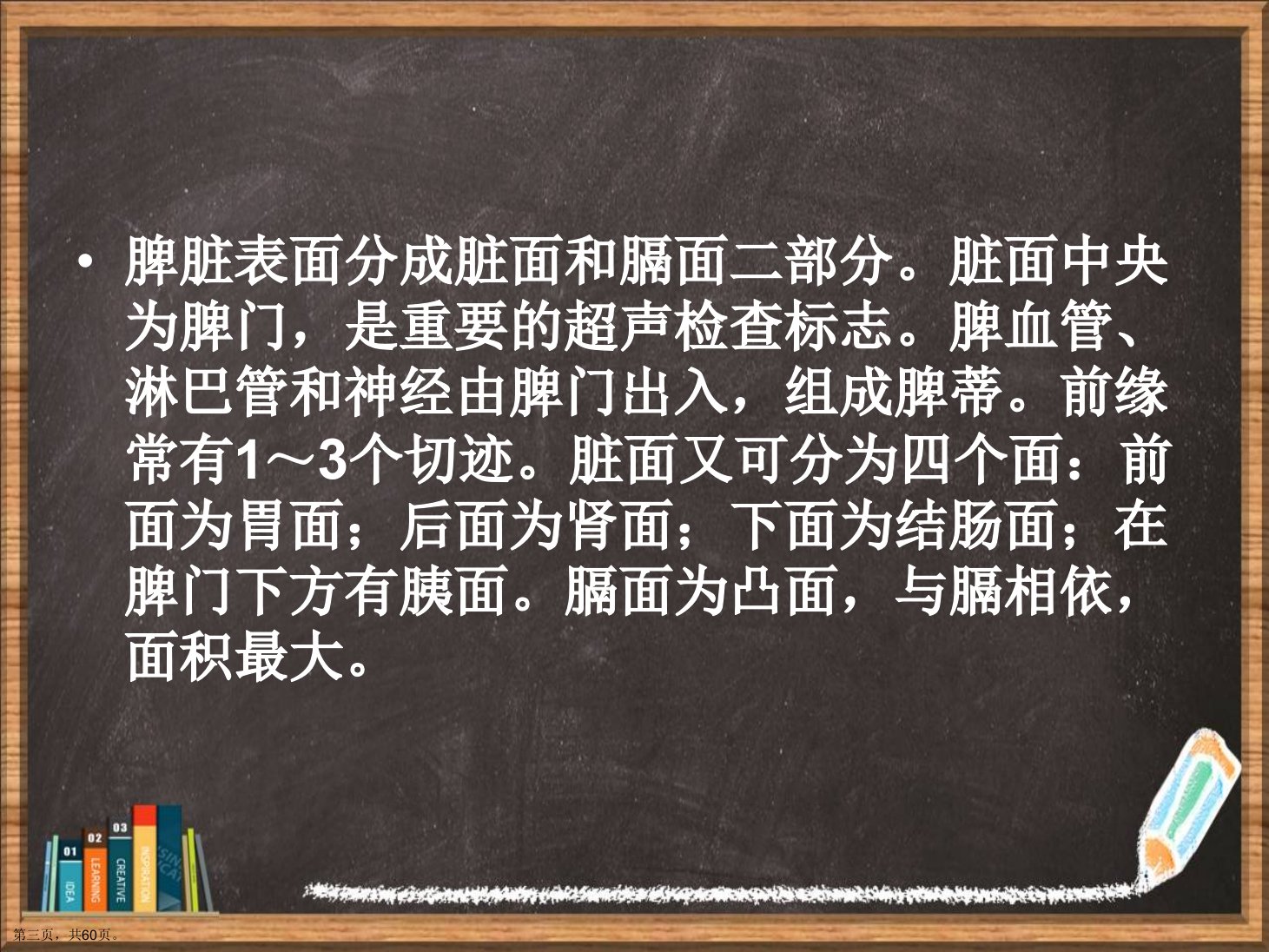 (优选)脾脏疾病超声诊断课件第一页,共60页。一、脾脏超声解剖概要脾脏是人体最大的周围淋巴器官,位于左上腹深部的腹腔内。体表投影是:脾上极在腋中线相当于第9肋骨高度,下极约在左腋前线第11肋骨。长轴与左侧第10肋骨平行。脾外形似半圆形,大小约12x7x4cm,重约300g。排空储血后重约120~200g。由于受脾动脉流量和脾静脉压力的影响,个体差异很大。第二页,共60页。脾脏表面分成脏面和膈面二部分。脏面中央为脾门,是重要的超声检查标志。脾血管、淋巴管和神经由脾门出入,组成脾蒂。前缘常有1~3个切迹。脏面又可分为四个面:前面为胃面;后面为肾面;下面为结肠面;在脾门下方有胰面。膈面为凸面,与膈相...