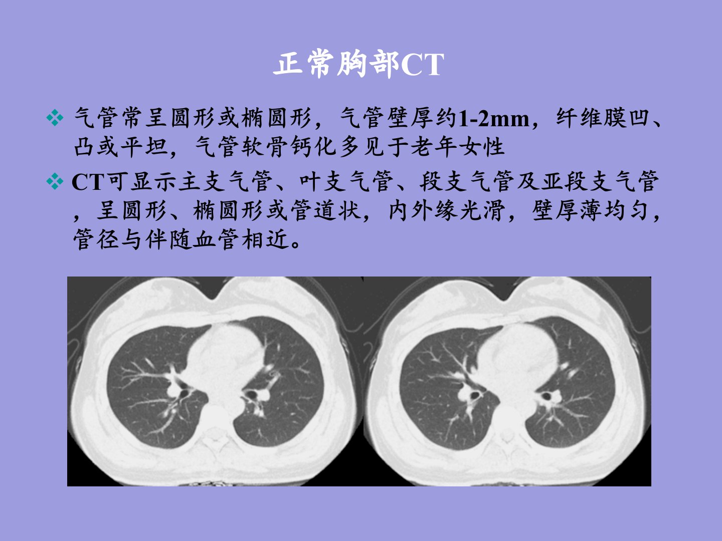 胸部CT基本病变解读一、正常胸部CT气管常呈圆形或椭圆形,气管壁厚约1-2mm,纤维膜凹、凸或平坦,气管软骨钙化多见于老年女性CT可显示主支气管、叶支气管、段支气管及亚段支气管,呈圆形、椭圆形或管道状,内外缘光滑,壁厚薄均匀,管径与伴随血管相近。正常胸部CT气管常呈圆形或椭圆形,气管壁厚约1-2mm,纤维膜凹、凸或平坦,气管软骨钙化多见于老年女性CT可显示主支气管、叶支气管、段支气管及亚段支气管,呈圆形、椭圆形或管道状,内外缘光滑,壁厚薄均匀,管径与伴随血管相近。正常胸部CT肺内血管自肺门向外围延伸,逐渐变细,肺段动脉分支伴行于同名支气管,多位于支气管的前、外、上方,肺段静脉主干则位于同名支气...