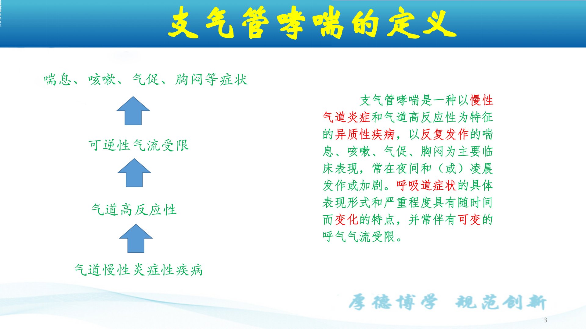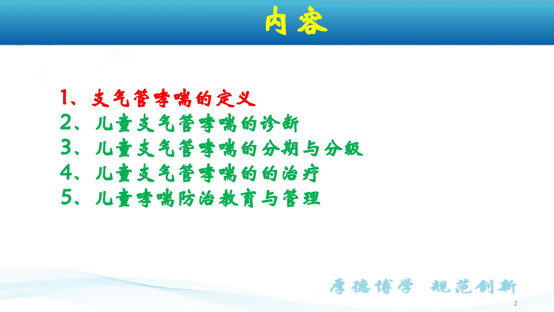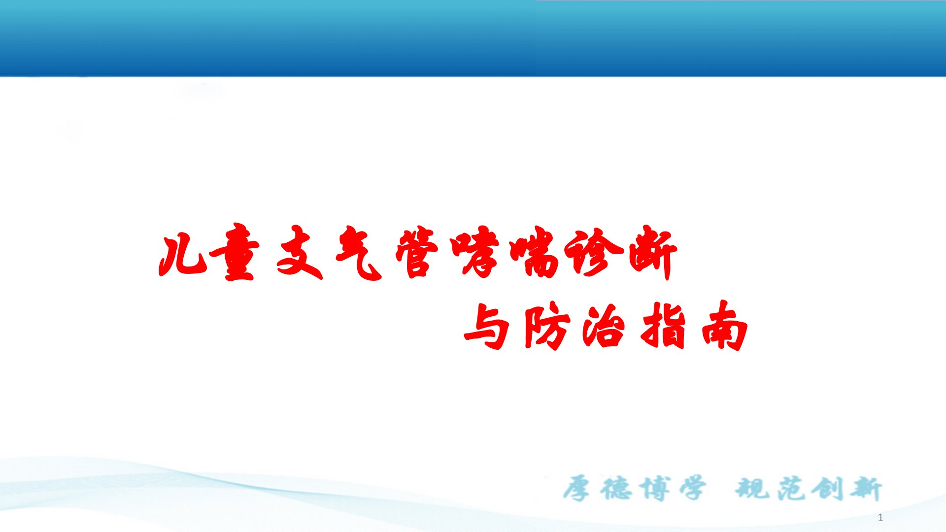 儿童支气管哮喘诊断与防治指南内容1、支气管哮喘的定义2、儿童支气管哮喘的诊断3、儿童支气管哮喘的分期与分级4、儿童支气管哮喘的的治疗5、儿童哮喘防治教育与管理支气管哮喘的定义喘息、咳嗽、气促、胸闷等症状气道慢性炎症性疾病气道高反应性可逆性气流受限支气管哮喘是一种以慢性气道炎症和气道高反应性为特征的异质性疾病,以反复发作的喘息、咳嗽、气促、胸闷为主要临床表现,常在夜间和(或)凌晨发作或加剧。呼吸道症状的具体表现形式和严重程度具有随时间而变化的特点,并常伴有可变的呼气气流受限。内容1、支气管哮喘的定义2、儿童支气管哮喘的诊断3、儿童支气管哮喘的分期与分级4、儿童支气管哮喘的的治疗5、儿童哮喘防治教...