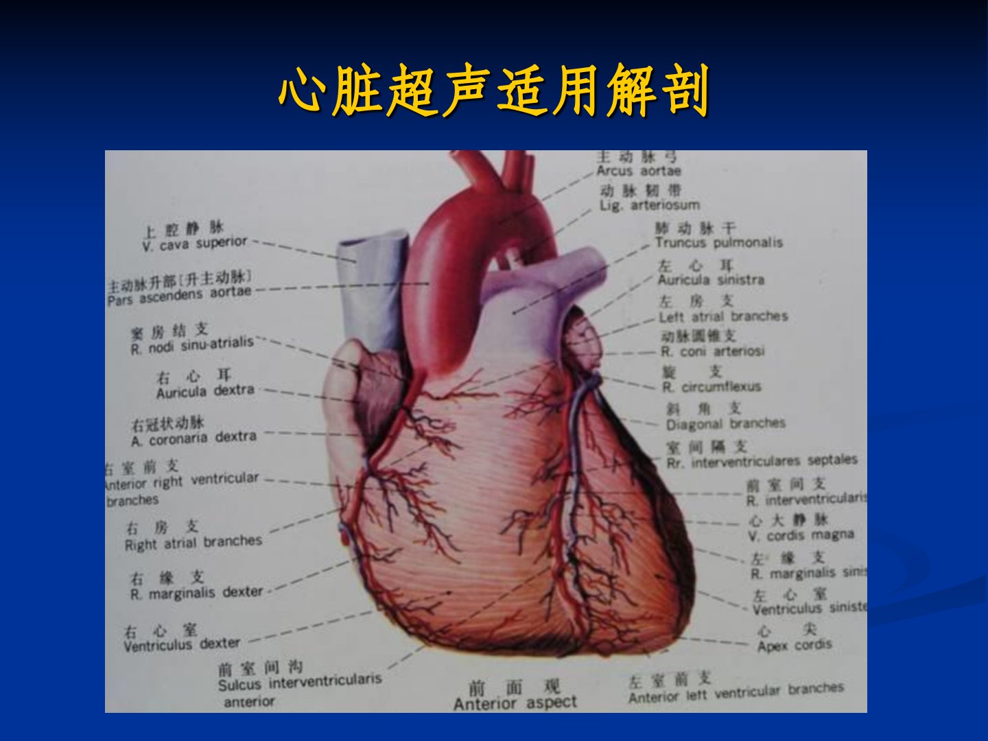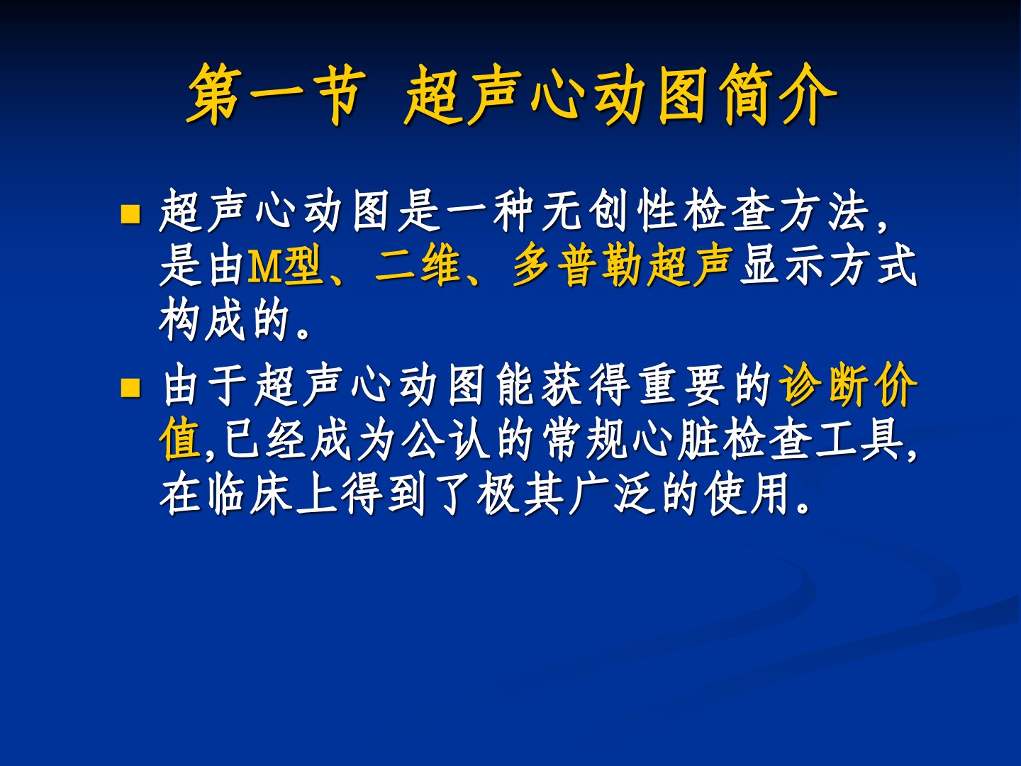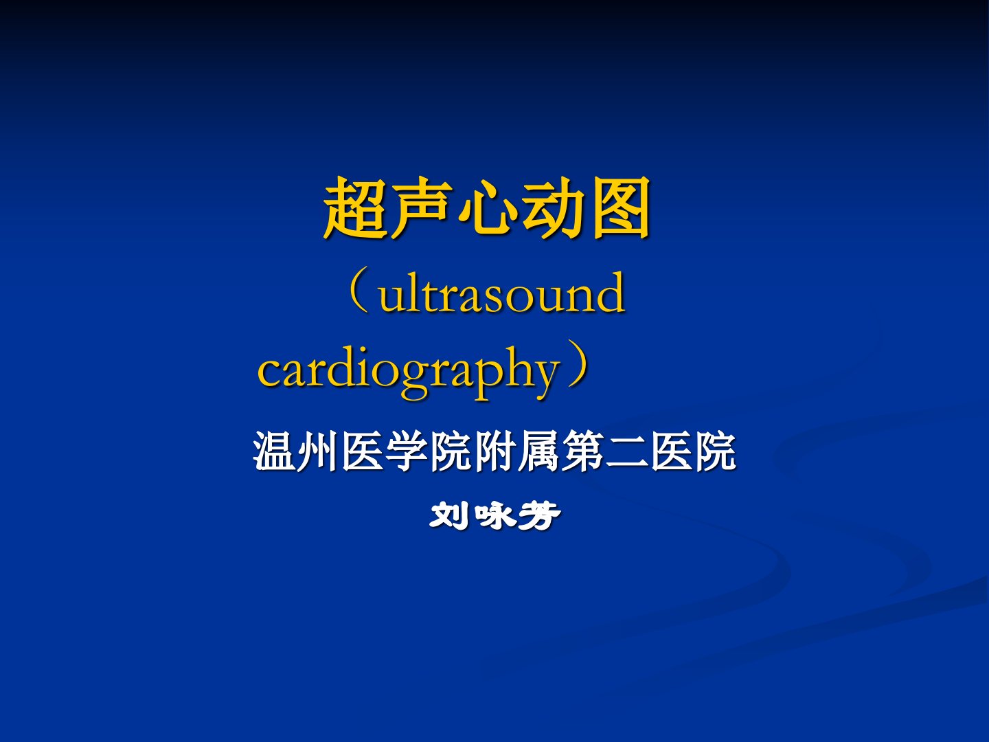 超声心动图(ultrasoundcardiography)温州医学院附属第二医院刘咏芳第一节超声心动图简介超声心动图是一种无创性检查方法,是由M型、二维、多普勒超声显示方式构成的。由于超声心动图能获得重要的诊断价值,已经成为公认的常规心脏检查工具,在临床上得到了极其广泛的使用。心脏超声适用解剖心脏超声适用解剖心脏超声适用解剖探头的选择成人常用2.0~3.5MHz的探头,儿童和瘦小者可适当提高频率。探头类型选用扇形或相控阵探头。探头放置的位置探头的放置部位通常有:胸骨旁位、心尖位、剑突下位和胸骨上窝位,其中以前两者多用。第二节正常超声心动图㈠M型超声心动图(M—modeechocardiogra...