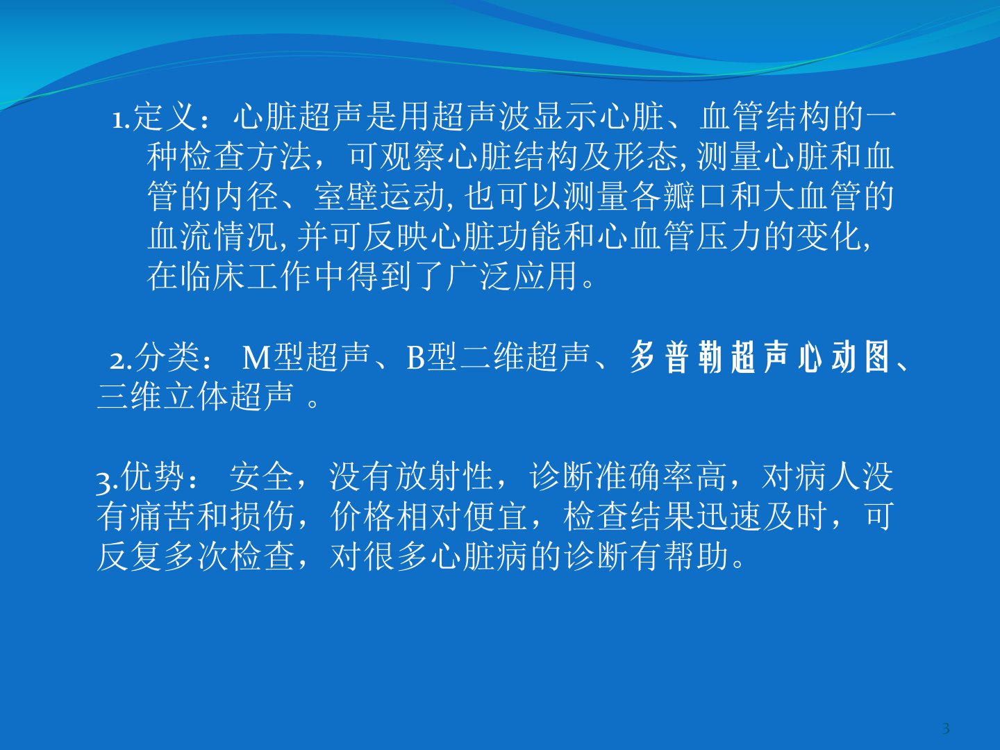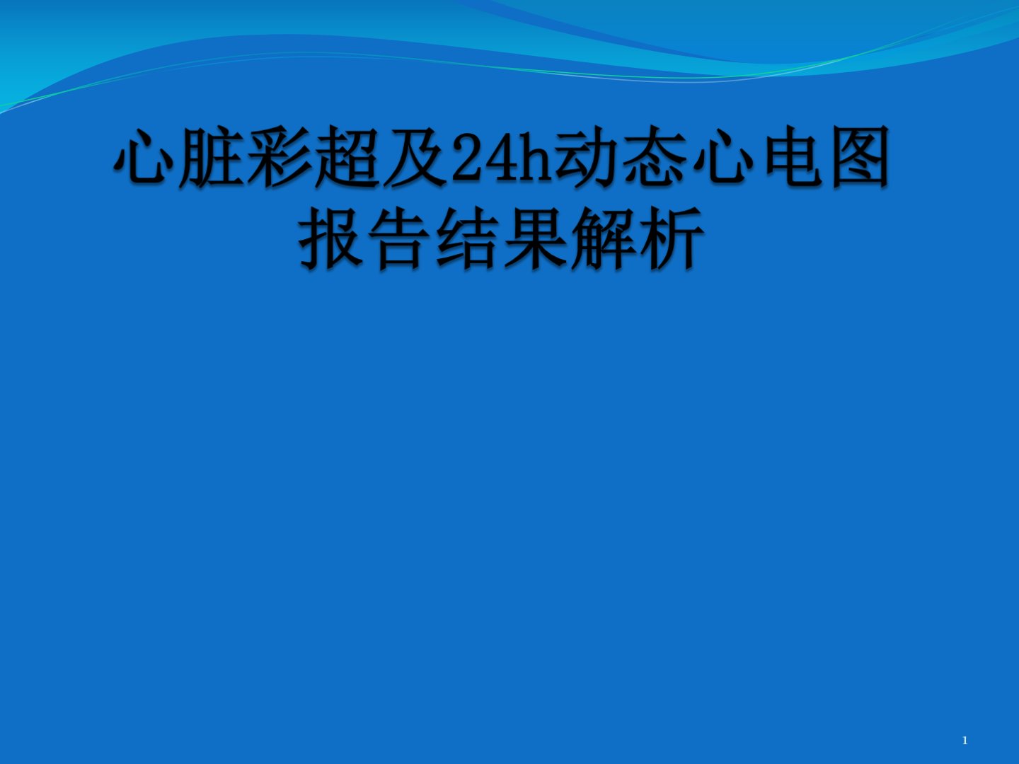心脏彩超及24h动态心电图报告结果解析一、心脏彩超1.定义:心脏超声是用超声波显示心脏、血管结构的一种检查方法,可观察心脏结构及形态,测量心脏和血管的内径、室壁运动,也可以测量各瓣口和大血管的血流情况,并可反映心脏功能和心血管压力的变化,在临床工作中得到了广泛应用。2.分类:M型超声、B型二维超声、多普勒超声心动图、三维立体超声。3.优势:安全,没有放射性,诊断准确率高,对病人没有痛苦和损伤,价格相对便宜,检查结果迅速及时,可反复多次检查,对很多心脏病的诊断有帮助。人体组织声学类型①无反射型(体液血液)②少反射型(室间隔、肝脏)③多反射型(心瓣膜、实质回声)④全反射型(骨、气体、肺脏)心腔:四...