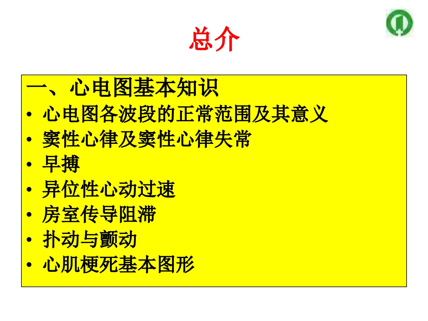 心电图基本知识和心电监护总介一、心电图基本知识心电图各波段的正常范围及其意义窦性心律及窦性心律失常早搏异位性心动过速房室传导阻滞扑动与颤动心肌梗死基本图形二.心电监护监护仪基本组成监护仪工作原理多功能监护仪的操作步骤使用心电监护时的注意事项多功能监护仪常见故障监护仪的保养心电图基本知识临床心电图学心电图(ECG)是心脏功能(电活动)被有选择地描记在有格的纸带上,并给我们一个心脏活动的永久性记录。通过分析心电图各波,结合其他临床资料,给以适当解释,以辅助临床诊断的科学。心电图各波段的正常范围及其意义1.P波:代表左右心房除极的波形。1.P波的振幅2.P—R间期:代表自心房肌开始除极到心室肌开始除...
