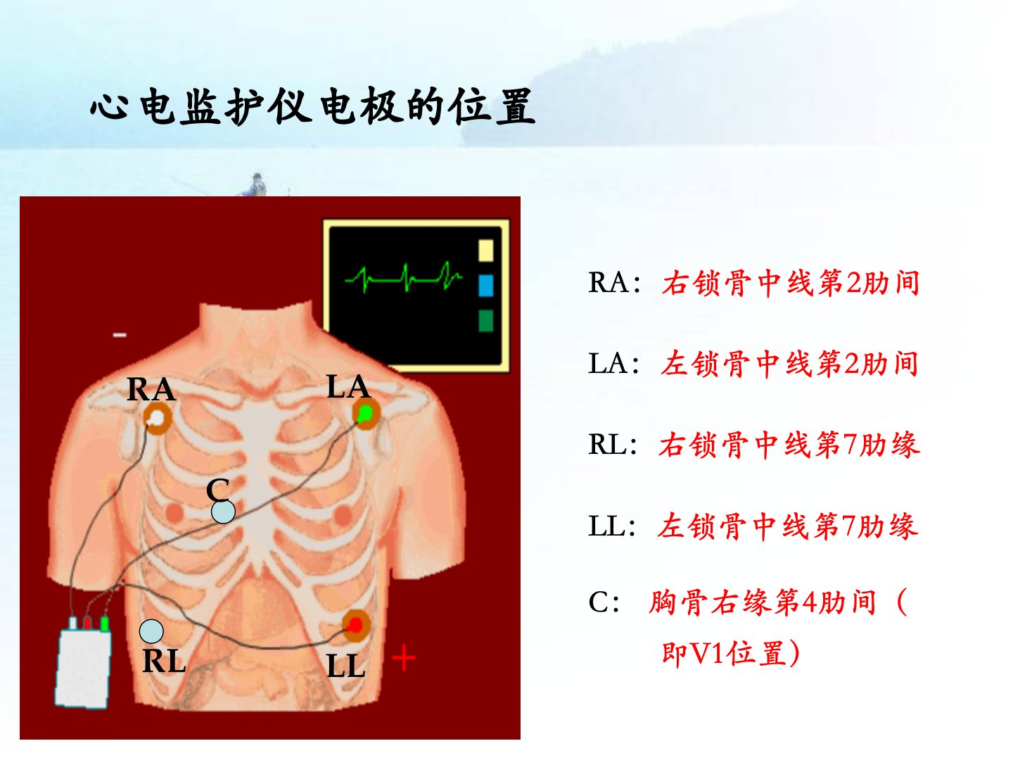 作为医生对心电图心律失常识别的要点如下:心电监护仪电极位置:RA在右锁骨中线第2肋间LA在左锁骨中线第2肋间RL在右锁骨中线第7肋缘LL在左锁骨中线第7肋缘C在胸骨右缘第4肋间。心电图检测要点:定标电压1cm1mV纵坐标每小格01mV横坐标每小格004sec。需关注综合波、间期和段:P波表示心房除极化;PR间期为P波与PR段合计;QRS波群表示心室除极化;ST段后出现T波;QT间期代表心室肌除极和复极全过程;T波由心室复极化形成;U波在T波后002004sec出现。心律失常分类:包括窦性、房性、交界性、室性心律失常房室、室内传导阻滞等。其中窦性心律P波规律频率60100次min;窦性心动过缓频率低于60次min;窦性心动过速成人超过100次min;窦性心律不齐节律不整;窦性停搏PP间期显著延长。此外还有房性、交界性、室性早搏及心动过速等多种类型。