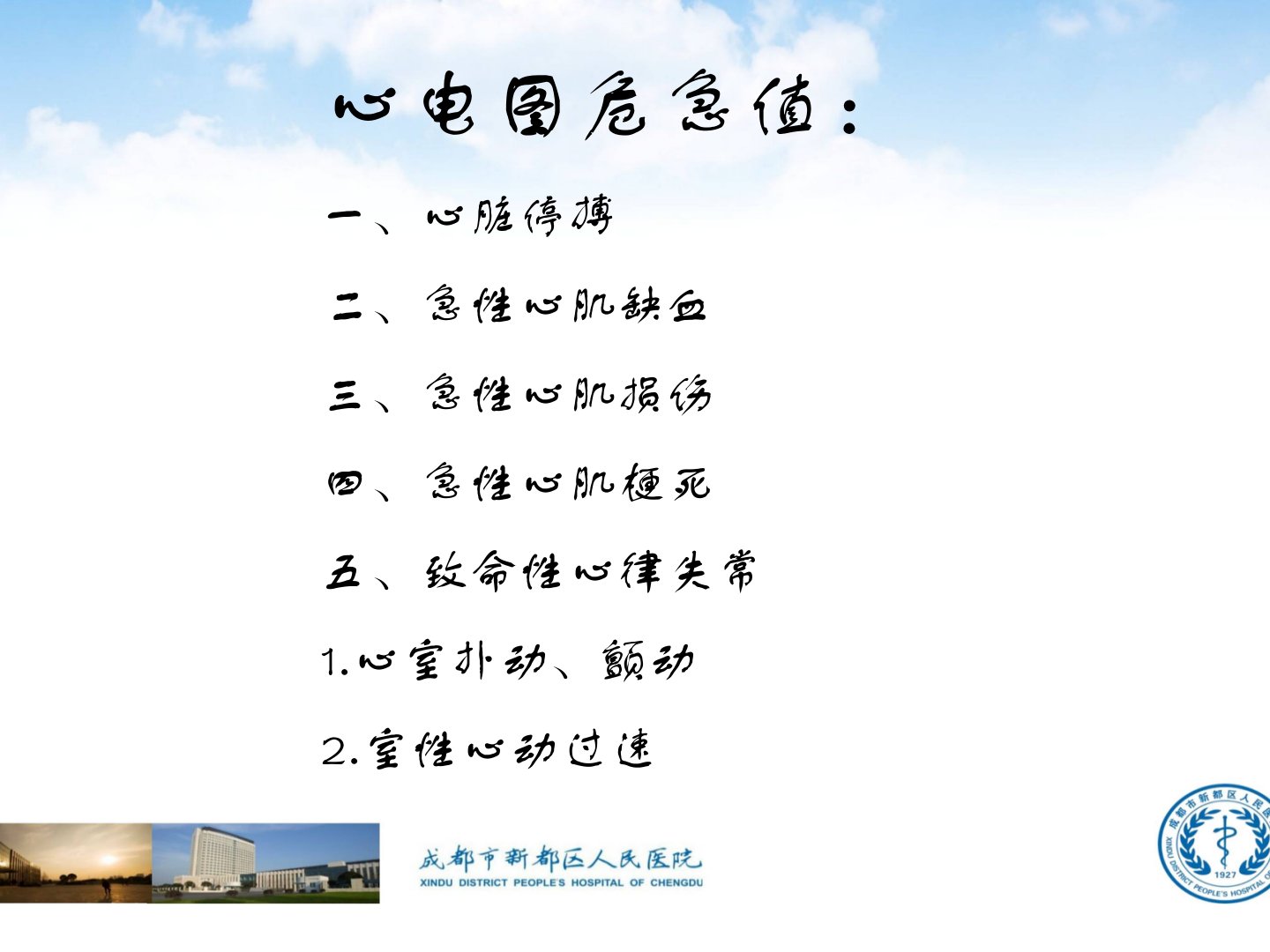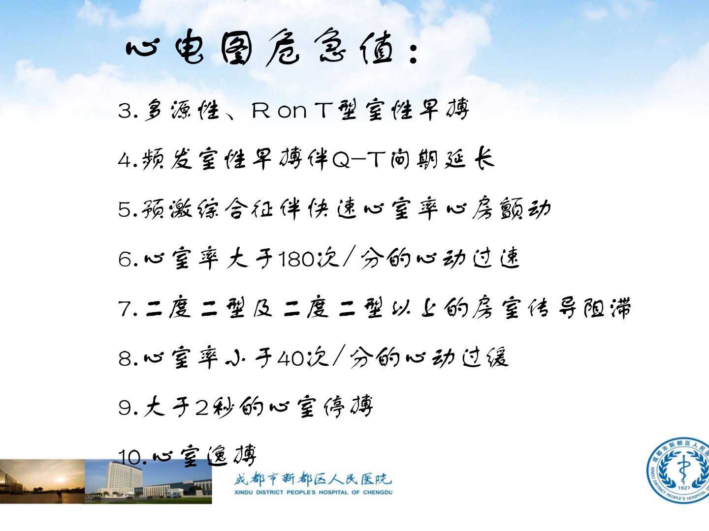 新都区人民医院心内科邓诗武介绍了心电图危急值相关知识内容如下:心电图危急值包括心脏停搏、急性心肌缺血损伤梗死及致命性心律失常等。其中STEMI患者典型心电图表现为除V2、V3导联外2个或以上连续导联J点后的ST段弓背向上抬高01mV;新发的左束支传导阻滞也提示STEMI;典型NSTEACS的心电图特点为:同基线心电图比较至少2个相邻导联ST段压低01mV或者T波改变并呈动态变化。致命性心律失常包括快速性和缓慢性两类前者如心室扑动颤动、室性心动过速等后者如二度二型及以上的房室传导阻滞、心室率小于40次分的心动过缓等。对于心室扑动应进行直流电除颤和CPR。多形性室性心动过速常见于器质性心脏病诊治总原则为血液动力学不稳定按心室颤动处理稳定者鉴别QT间期后给予相应治疗。室性期前收缩诊治建议为明确基础心脏病及诱发因素治疗基础疾病纠正内环境紊乱等诱因判断是否可诱发其他严重心律失常。预激综合征伴快速心室率心房颤动血液动力学常不稳定若短时间内不能自行终止应首选同步电复律复律后建议射频消融治疗。缓慢性心律失常轻者可无症状重者可造成血液动力学障碍应积极寻找并治疗可逆性诱因症状性心动过缓应尽早实行起搏治疗。