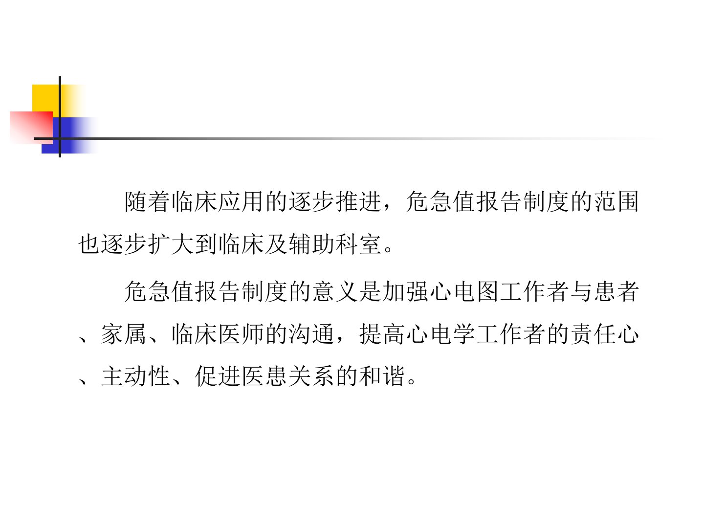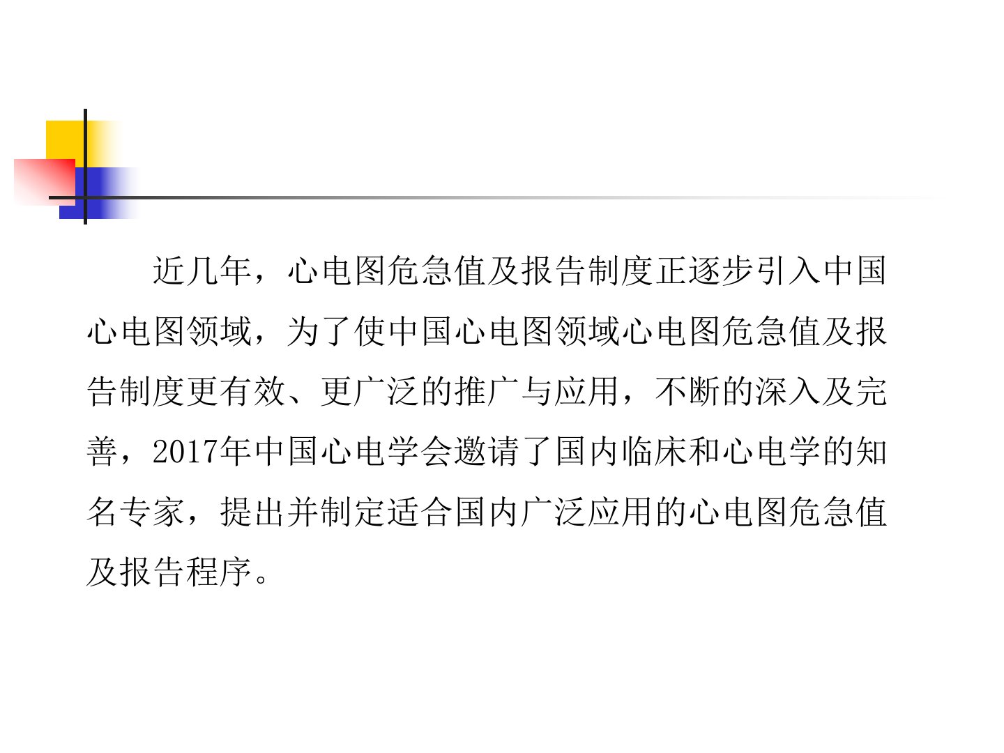 近几年心电图危急值及报告制度正逐步引入中国心电图领域。为更有效推广与应用该制度2017年中国心电学会邀请专家制定适合国内的心电图危急值及报告程序范围逐步扩大到临床及辅助科室。该制度可加强心电图工作者与患者、家属、临床医师的沟通促进医患关系和谐。危急值心电图指异常诊断结果表明患者可能处于生命危险边缘状态需迅速提示临床给予干预措施否则可能失去最佳抢救机会。中国心电图危急值建议包括:一、疑似急性冠脉综合征包括不稳定型心绞痛、非ST段抬高型急性心梗等;二、严重快速性心律失常如心室扑动、心室颤动等;三、严重缓慢性心律失常如极缓慢的窦性心动过缓、三度房室传导阻滞等;四、其它如高血钾、低血钾、疑似急性肺栓塞等。临床医务人员、心电图医师一旦发现核准危急值后要立即上报实施最佳干预及治疗提高抢救时效性与成功率挽救患者生命。
