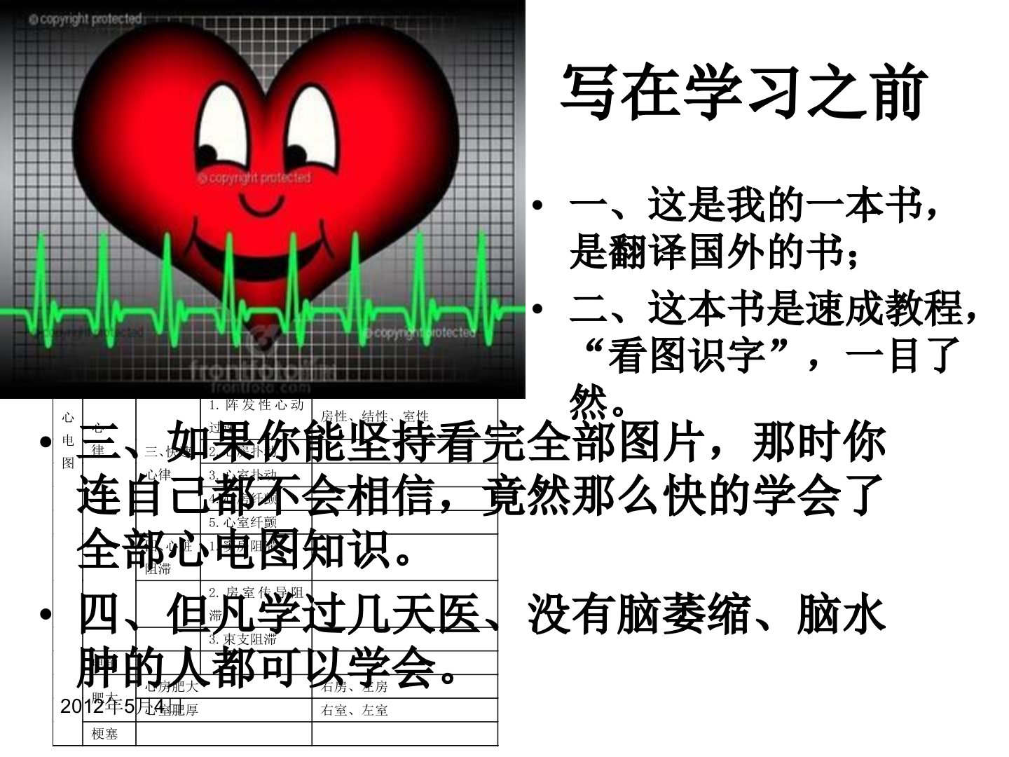 《简明心电图图解速成》由青县中医医院刘泽华于2012年5月4日写成。该书是翻译自国外的速成教程采用“看图识字”的方式使心电图知识学习变得直观易懂。作者强调只要学习者有医学基础且无脑部疾病坚持看完书中全部图片便能迅速掌握全部心电图知识学习效果之快可能连自己都会感到惊讶。书中每个画面都很重要作者建议读者从第一个画面开始不要漏掉任何一个画面确保每个图都弄懂这样将能取得显著的学习效果。