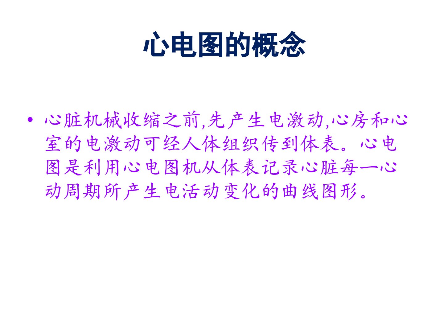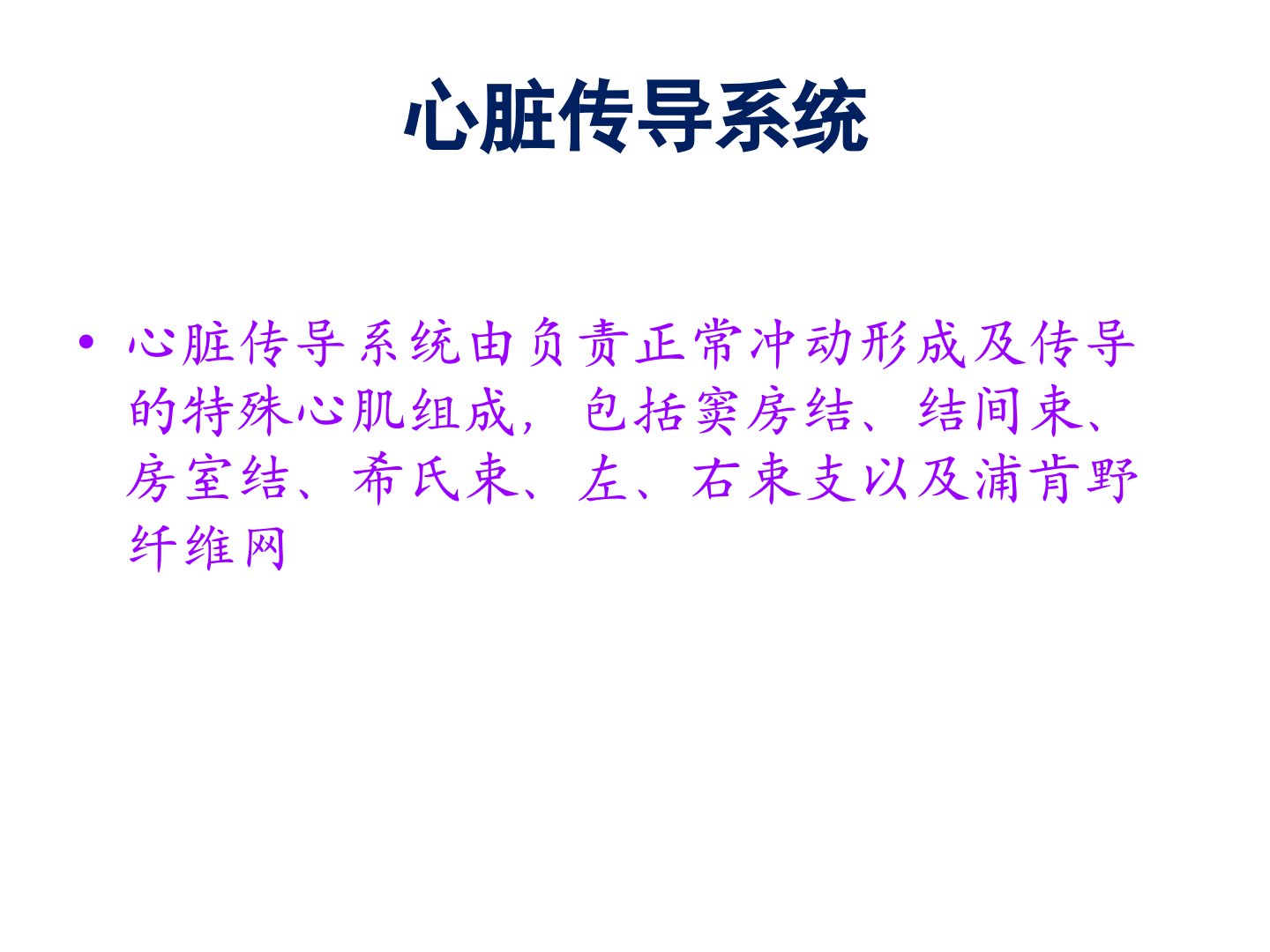 心电图是利用心电图机从体表记录心脏每一心动周期电活动变化的曲线图形。心脏传导系统由特殊心肌构成负责正常冲动形成与传导心脏激动的正常传导顺序涉及窦房结、结间束、房室结等多个部分。心电图测量中走纸速度为25mms电压为10mmmV。心律齐时HR60PP或RR;心律不齐时6s内的QRS波群数乘以10可算出心室率。心电图各波段有不同产生原理和正常值如P波代表心房肌除极时限正常人为012s;PR间期代表心房开始除极至心室开始除极的时间时限为012020s;QRS波群代表心室肌除极时间正常人为011s;ST段代表心室缓慢复极过程;T波代表心室快速复极时的电位变化;QT间期代表心室肌除极和复极全过程所需要的时间。此外还有常规十二导联系统包括肢体导联系统和胸导联系统分别反映额状面和水平面情况。窦性心律时P波规律出现且形态表明激动来自窦房结。
