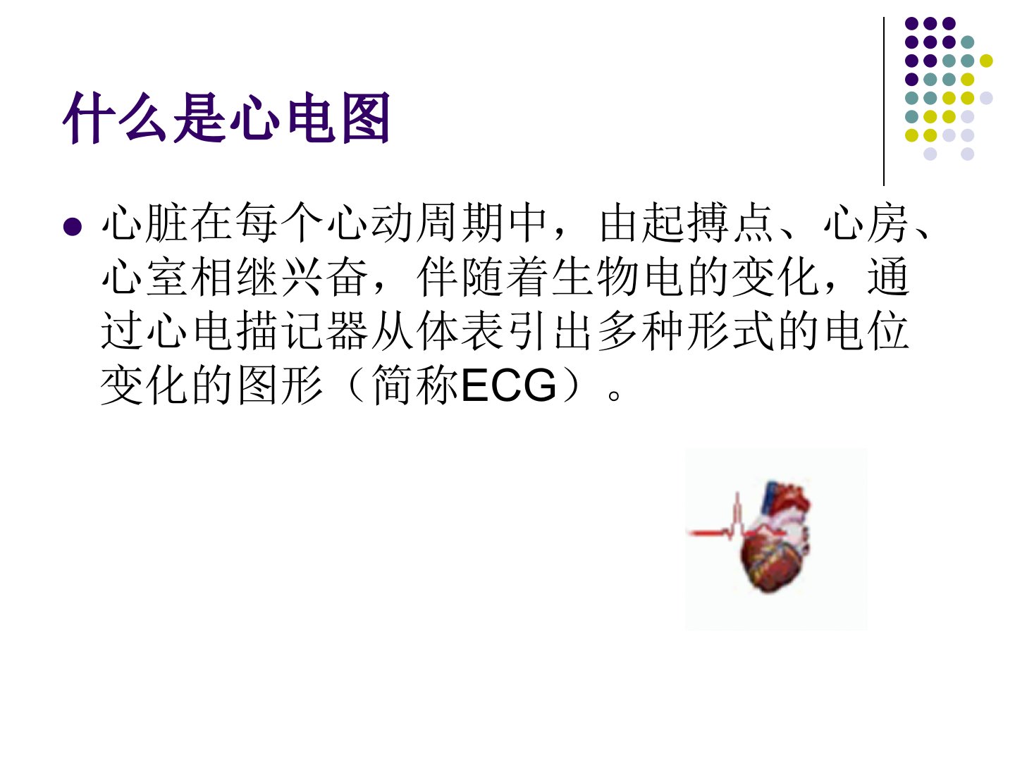 心电图(ECG)是记录心脏每个心动周期中生物电变化的图形。心脏兴奋时伴随的生物电变化可通过心电描记器从体表引出。其中II、III导联的电位变化与心肌细胞数量、厚度成正比与探测电极位置和心肌细胞距离成反比还与探测电极方向和心肌除极方向构成的夹角有关。心电图上的各波段和间期具有特定意义如P波代表心房除极QRS波代表心室除极T波代表心室复极U波受后继电位影响;PR间期表示心房到心室除极的时间QRS间期表示心室除极时间QT间期表示心室除极和复极全过程时间ST段反映心室供血状态。此外P向量环、QRS向量环在额面和胸前导联有特定投影病理状态下除极顺序变化会产生异常QRS波。T波与QRS主波方向一致与温度差、压力差有关若不一致则提示外膜心肌缺血。