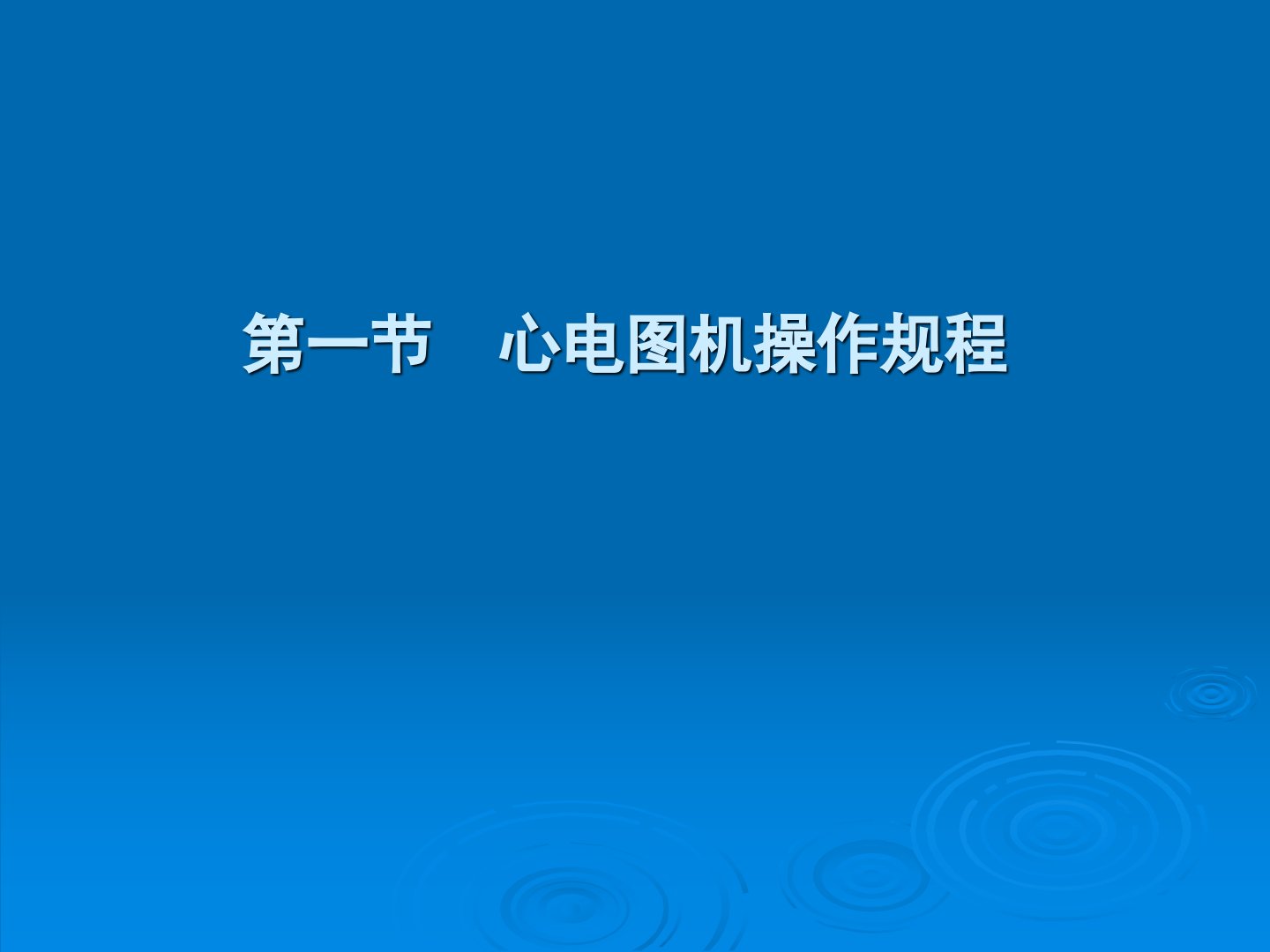 心电图第一章正常心电图第一节心电图机操作规程将导联电极连接于人体各部位。(1)肢体导联电极:上肢电极板固定于腕关节上方3cm处(上肢内侧);下肢电极板固定于下肢胫骨内踝上方7cm处。肢体导联线均为黑色,末端接电极板处有颜色标记,以区别上下左右。①红色端电极接右上肢;②黄色端电极接左上肢;③绿色端电极接左下肢;④黑色端电极接右下肢。注:下肢两电极可置于同一侧,但电极板不能相互接触,处于隔离状态即可。上述连接方式可使I、Ⅱ、Ⅲ、aVR、aVL、aVF导联成立第一节心电图机操作规程(2)胸前导联电极:一般导线颜色为白色,导线末端接电极处有颜色区别导联。颜色排列依次为红、黄、绿、褐、黑、紫,分别代表C...