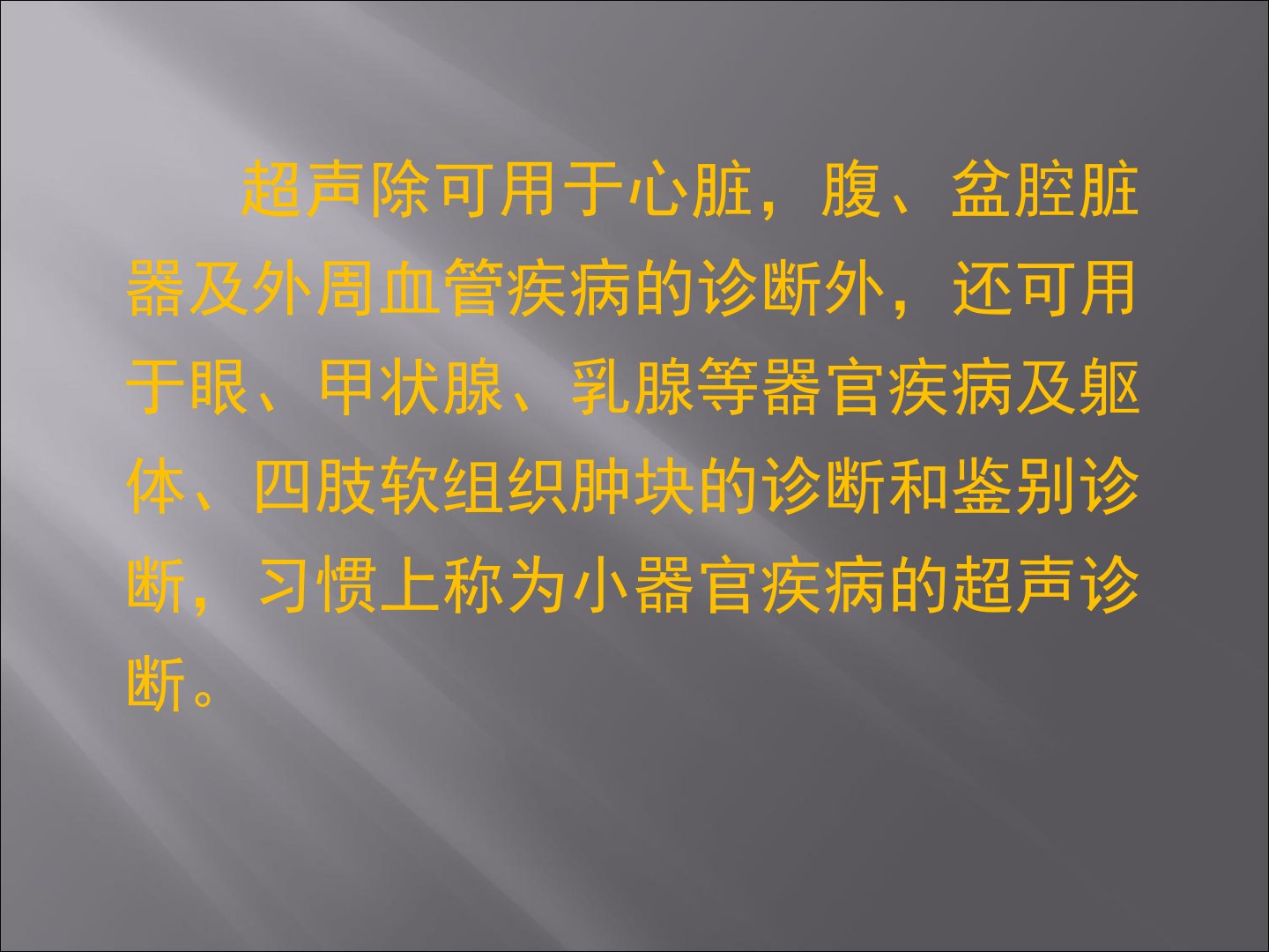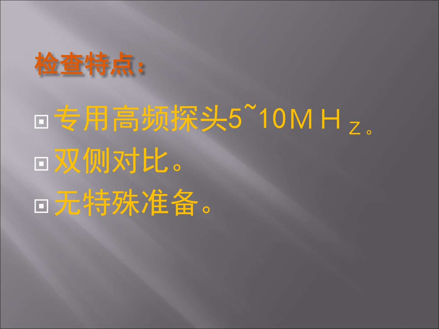 重庆医科大学涂波医生介绍了小器官疾病的超声诊断价值及常见疾病超声表现:1小器官超声诊断特点与价值:使用高频探头双侧对比无需特殊准备。可观察器官大小、占位病变及其性质、血供评估良恶性并引导穿刺活检与治疗。2眼部超声诊断:介绍了眼球超声解剖结构以及视网膜脱离、玻璃体出血的声像图表现和CDFI特征。3乳腺超声诊断:介绍了乳腺解剖、血液供给、淋巴回流和正常声像图。乳腺炎、乳腺增生、乳腺囊肿、乳腺纤维腺瘤、乳腺癌有不同的临床表现和声像图表现。4甲状腺超声诊断:介绍了甲状腺的超声解剖结构。原发性甲状腺功能亢进、甲状腺腺瘤有不同的声像图表现。5阴囊及其内容物超声诊断:介绍了阴囊及其内容正常解剖及超声表现。鞘膜积液、睾丸扭转有不同的超声表现。
