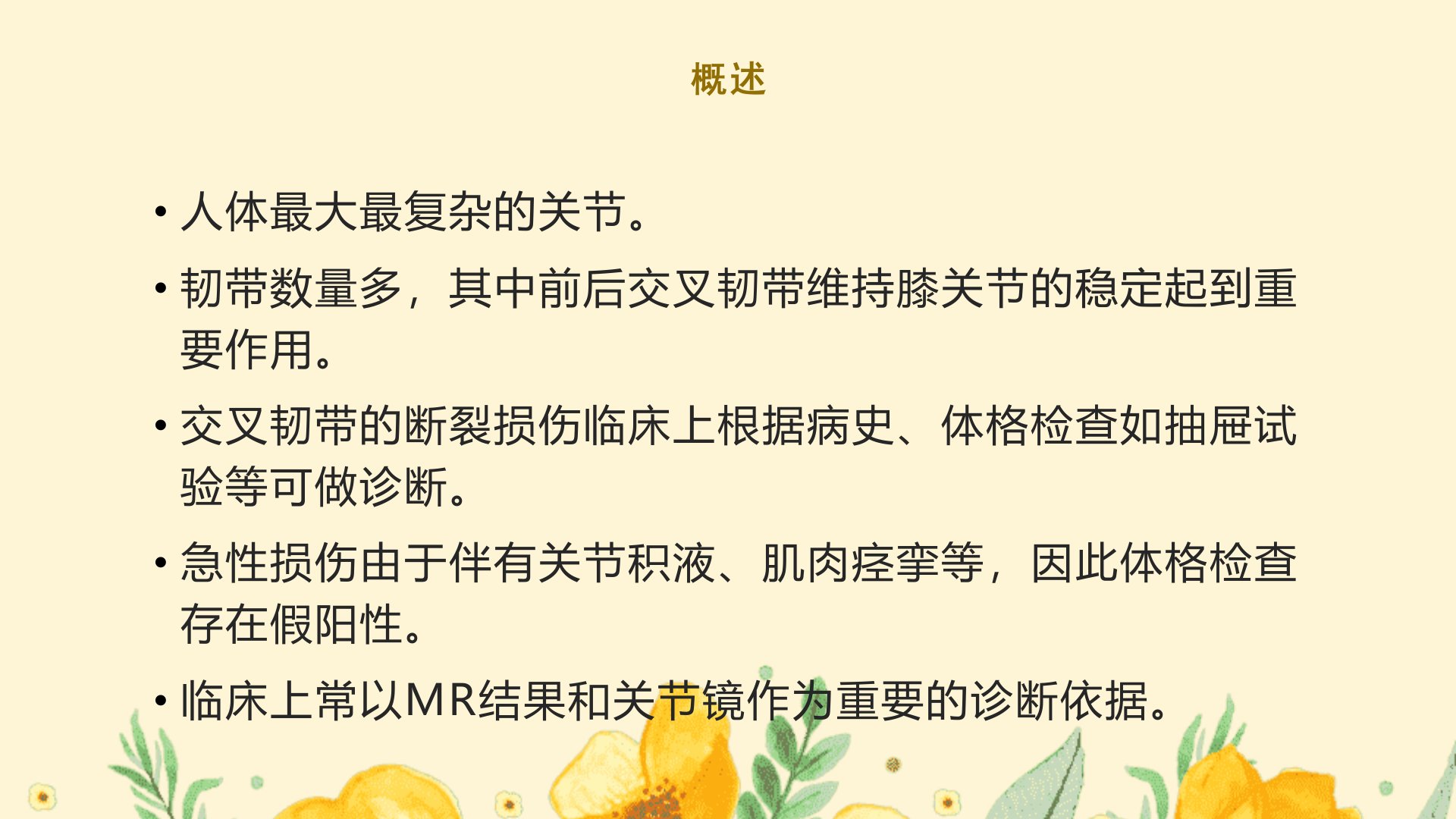 膝关节是人体最大且最复杂的关节其稳定性依赖于众多韧带包括囊内韧带(如前后交叉韧带)和囊外韧带(如髌韧带、内外侧副韧带)。交叉韧带断裂损伤可通过病史、体格检查初步诊断但急性损伤时体格检查易出现假阳性故MR和关节镜是重要诊断依据。韧带主要由胶原纤维构成损伤时表现为水肿或出血T2WI上呈高信号。前交叉韧带(ACL)起自胫骨止于股骨作用是限制胫骨过度前移等损伤时T2WI判断断裂效果好常见撕裂部位在韧带中部。后交叉韧带(PCL)作用包括限制胫骨后移等损伤分完全撕裂和部分撕裂。内侧、外侧副韧带分别防止膝外翻、内翻损伤有直接、间接征象且分三级。半月板为纤维软骨结构内侧呈“C”型外侧近似“O”型损伤多因急骤强力运动内侧损伤机会较多常见分型包括斜形撕裂、水平撕裂等分级包括IIV级。此外还有半月板囊肿、盘状半月板等特殊情况。