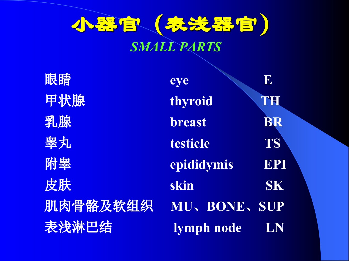 韩增辉小器官疾病超声多普勒诊断及新进展DopplerUltrasoundanditsProgressintheDiagnosisofSmallPartsDisease概述小器官(表浅器官)SMALLPARTS眼睛eyeE甲状腺thyroidTH乳腺breastBR睾丸testicleTS附睾epididymisEPI皮肤skinSK肌肉骨骼及软组织MU、BONE、SUP表浅淋巴结lymphnodeLN小器官超声诊断的发展历史1951年乳腺1952年骨与关节1956年眼睛1958年甲状腺70年代涎腺小器官超声诊断的技术进步A超2DUSB超3.5MHzPWD5.0MHzCDFI7.5MHzPDI1...