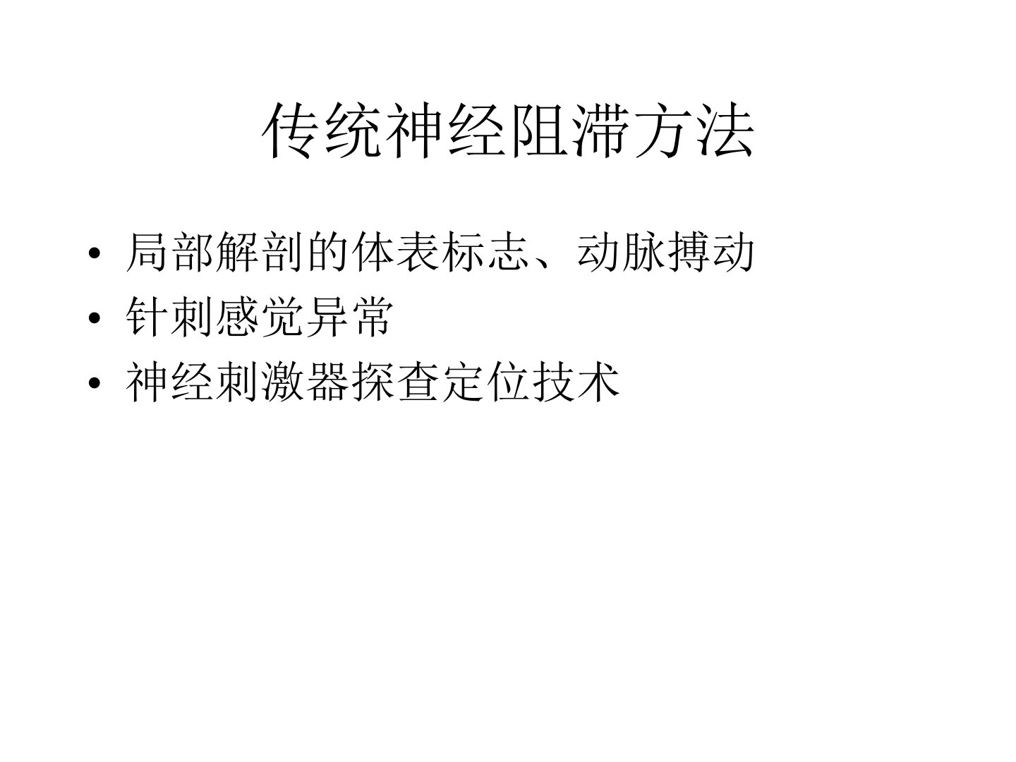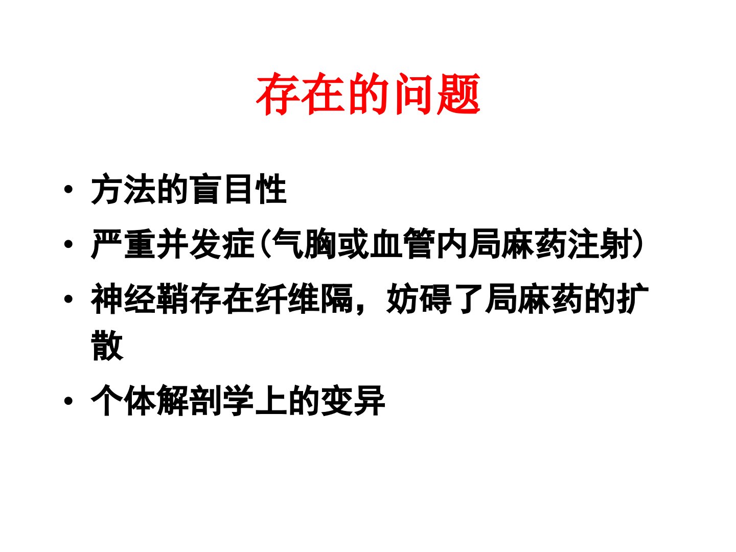 传统神经阻滞方法存在盲目性易导致严重并发症如气胸或血管内局麻药注射且神经鞘纤维隔及个体解剖学变异会影响局麻药扩散。超声引导技术自1979年文献报道以来随着技术和设备发展应用逐渐增多。该技术通过超声扫描精确定位神经可提高操作成功率和麻醉质量缩短药物起效时间降低局麻药用量使病人更舒适且适应范围更广能克服解剖变异穿刺困难适用于小儿、意识不清、已部分神经阻滞或全身麻醉病人。目前无严重并发症报道可避免神经损伤、误穿血管和胸膜等严重问题。但操作时需注意避开神经防止异感通常进针到浅表神经束间注入58ml局麻药。