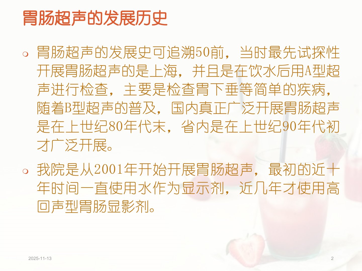 郫县西医结合医院超声科徐其国介绍了胃肠超声检查的发展历史其可追溯到50年前上海首次试探性开展。我院从2001年开始开展胃肠超声早期使用水作为显示剂近几年改用高回声型胃肠显影剂。胃肠道是消化系统发病率最高的脏器临床诊断方法包括X线钡剂造影、内窥镜、胃肠超声检查等。胃肠超声检查无痛、无创、低耗、高效且方便随着仪器性能提升和医生诊断水平的提高其准确率也不断提高。胃肠超声能穿透胃壁显示胃壁层次结构提供胃壁占位性病灶的信息估计病变侵犯程度为手术方式提供参考特别是能了解胃周器官的转移情况。胃肠超声和内窥镜互为补充前者还可观察胃肠道壁内及壁外情况。检查前需做好准备如安排在上午进行检查前禁食等。显影介质引入途径包括口服和灌肠显影介质类型有无回声型和高回声型。胃肠超声可准确测量胃壁厚度鉴别胃肠管壁增厚样改变和粗大粘膜皱襞诊断溃疡性病变显示肿瘤等病变的形态、大小、范围、内部结构确定病变的位置。胃肠病变基本征象包括管壁结构受损、管壁增厚、回声异常、功能紊乱等。文章还详细介绍了正常胃肠主要切面的超声图像、胃肠病变基本征象、胃肠常见病理征象以及胃炎、消化性胃溃疡、胃癌、胃恶性淋巴瘤、大肠癌、胃平滑肌瘤、胃息肉、