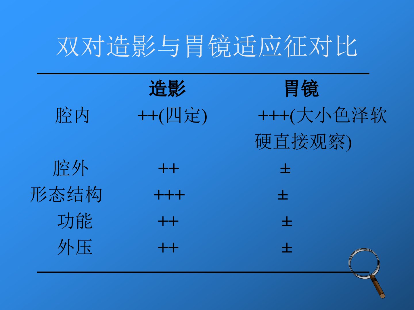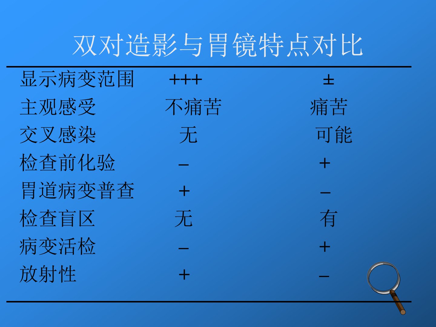 胃癌X线诊断涉及造影与胃镜可观察基本病变的X线表现包括轮廓龛影、充盈缺损、粘膜破坏等以及功能改变如张力、蠕动异常。进展期胃癌浸润至肌固有层以下深层X线可显示源于粘膜或粘膜下病变的不同特征。早期胃癌定义为粘膜或粘膜下层病变不论大小或有无转移分隆起型、表面型和凹陷型。胃癌病理X线表现包括增生型充盈缺损、浸润型狭窄僵硬、溃疡型龛影环堤等。鉴别时良性溃疡形态规整胃壁柔软;恶性溃疡形态不规则胃壁僵硬。胃溃疡X线可见龛影及周围透明带胃窦癌与胃窦炎的鉴别在于皱襞变化、轮廓整齐度、管壁僵硬及蠕动情况。此外还介绍了双对造影与胃镜在观察胃粘膜相、胃窦粘膜相等方面的特点对比。