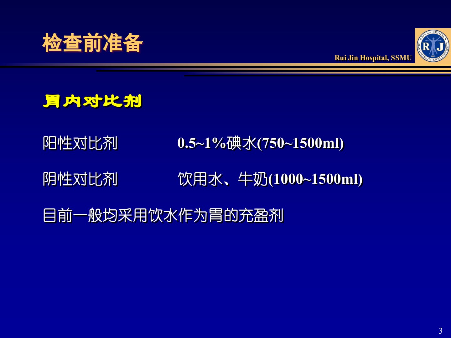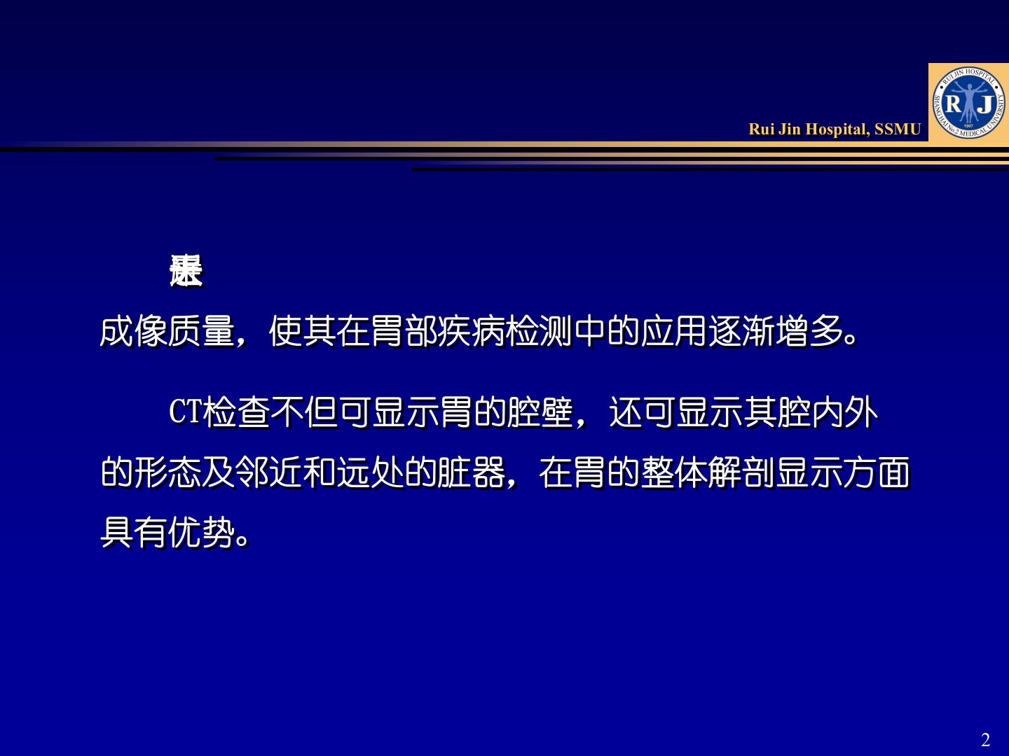 近年来多层CT技术进展明显改善了胃的CT成像质量使其在胃部疾病检测中的应用逐渐增多。CT检查可显示胃的腔壁、腔内外形态及邻近和远处脏器。胃内对比剂一般采用饮水作为胃的充盈剂病人检查前需空腹并饮水同时给予低张药物。扫描体位一般取仰卧体位根据情况选用斜位技术参数包括扫描层厚、重建层厚、MPR等。多层CT检查主要用于胃癌和其他胃肿瘤性病变的治疗前评估、分期及术后随访等。胃癌CT轴位图像显示双层胃壁结构CT可检出不同类型胃癌其中进展型胃癌检出率较高。胃淋巴瘤表现为胃壁均匀增厚胃间质瘤(GIST)大多向腔外生长且累及淋巴结出现融合的情况少见。胃炎表现为粘膜皱襞增厚和胃壁增厚形态柔和。此外CT还可用于胃溃疡、胃腺瘤、Mntrier病、胃静脉曲张等疾病的诊断。胃癌的CTTNM分期主要依据胃壁增厚程度、强化情况及淋巴结转移情况。