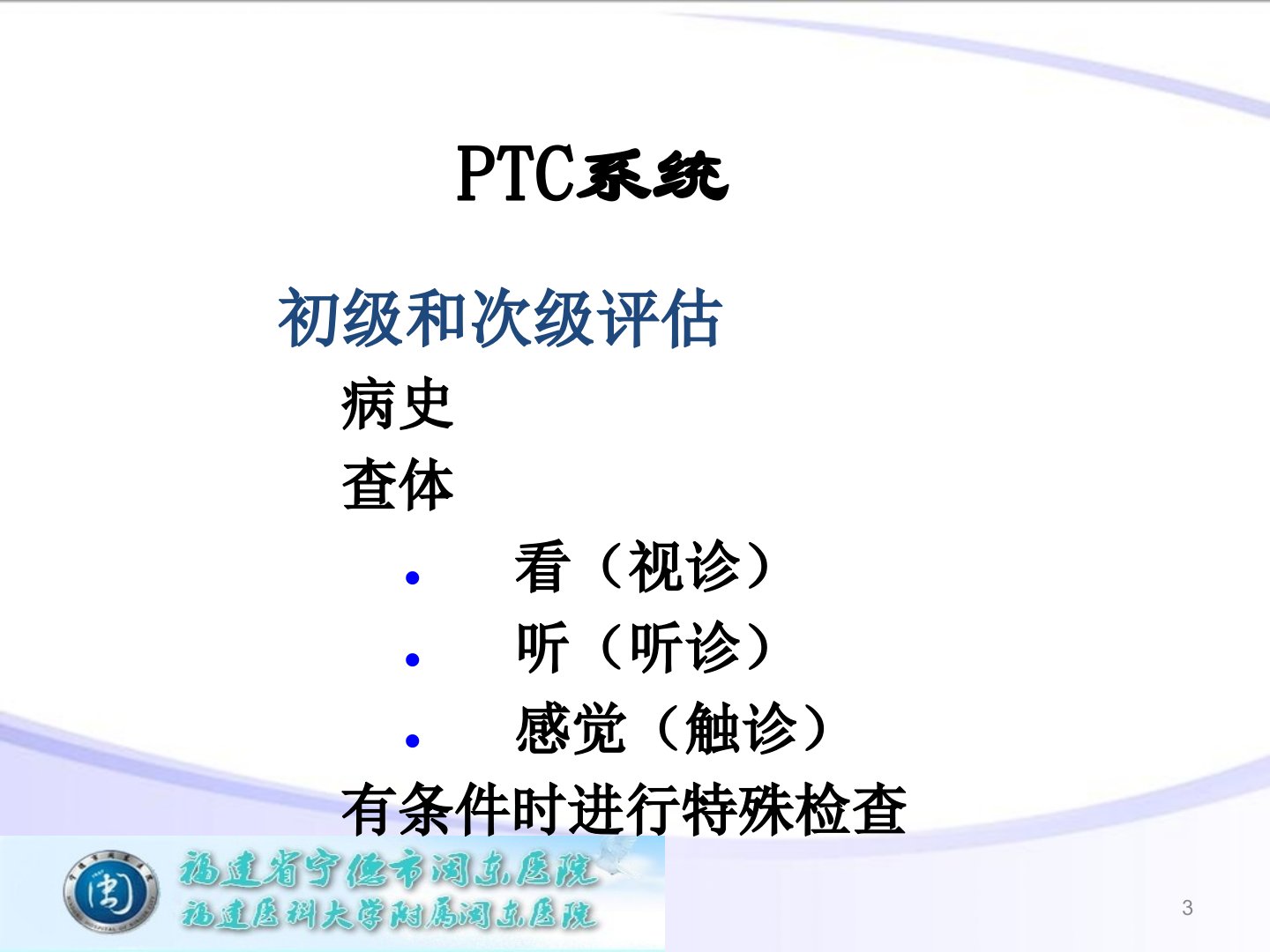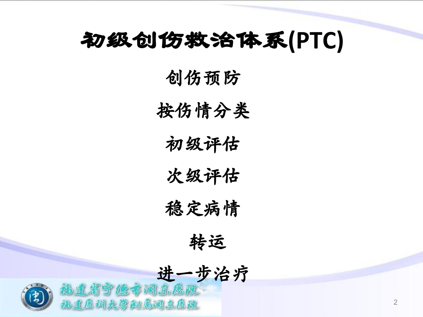 外伤急症—初级创伤救治体系初级创伤救治体系(PTC)创伤预防按伤情分类初级评估次级评估稳定病情转运进一步治疗PTC系统初级和次级评估病史查体看(视诊)听(听诊)感觉(触诊)有条件时进行特殊检查初级评估气道(A)呼吸(B)循环(C)神经功能障碍(D)显露(E)气道(A)评估视诊颜色呼吸困难意识状态胸廓运动呼吸音呼吸困难听诊触诊气道(A)注意事项气道梗阻颈椎损伤气道评估打鼾或咕噜音喘鸣烦躁(低氧)使用辅助呼吸肌胸廓反常运动紫绀气道梗阻的体征气道(A)管理首要问题是保持气道通畅清理口腔提下颏/托下颌放置口咽或鼻咽通气道气管插管颈椎外伤处理气道管理-基本技术提下颏托下颌气道管理-辅助技术口咽通气道鼻咽...