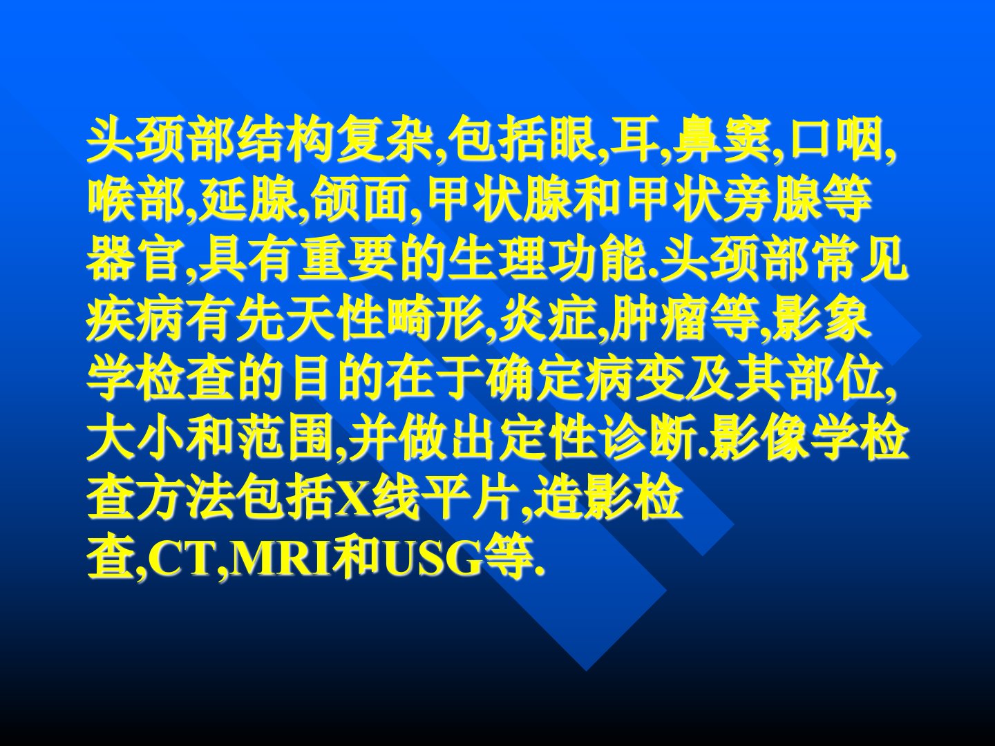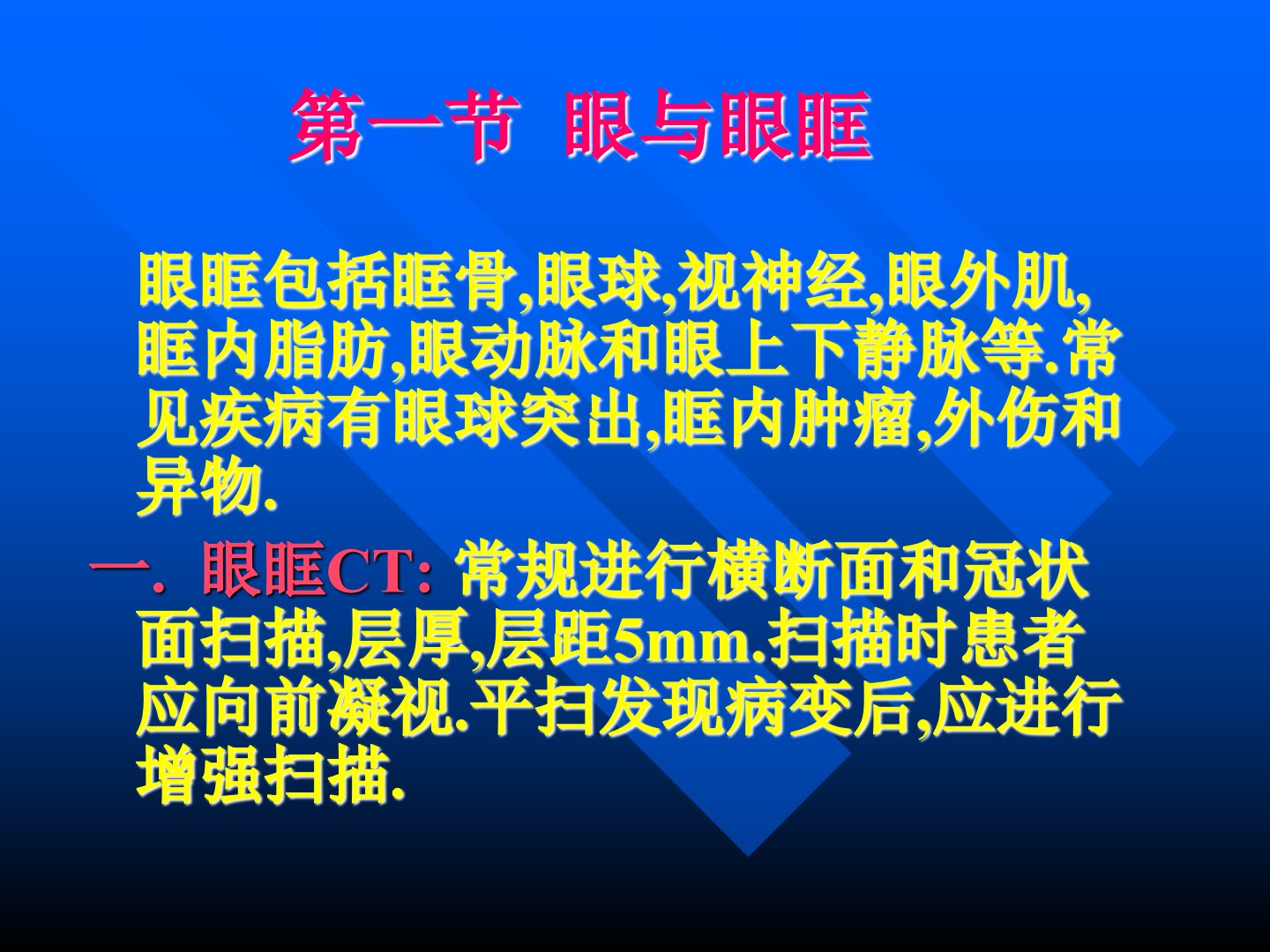 头颈部氨贩垦集亏箔澈鲤虞训犯介稿厦湘僳剖歉象恿析兴斡暇枕窿着虚讶陛网寇头颈部CT诊断PPT课件头颈部CT诊断PPT课件头颈部结构复杂,包括眼,耳,鼻窦,口咽,喉部,延腺,颌面,甲状腺和甲状旁腺等器官,具有重要的生理功能.头颈部常见疾病有先天性畸形,炎症,肿瘤等,影象学检查的目的在于确定病变及其部位,大小和范围,并做出定性诊断.影像学检查方法包括X线平片,造影检查,CT,MRI和USG等.故戚税病涡潞馏班胀利尖莎身烂讯蕊疟箍织汝蜕瓜钟贱缆谈那揭星棒吴兑头颈部CT诊断PPT课件头颈部CT诊断PPT课件第一节眼与眼眶眼眶包括眶骨,眼球,视神经,眼外肌,眶内脂肪,眼动脉和眼上下静脉等.常见疾病有眼球突...