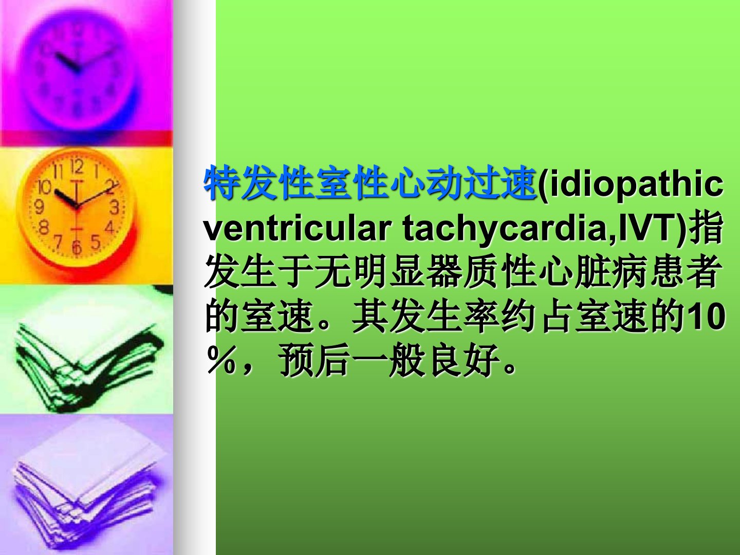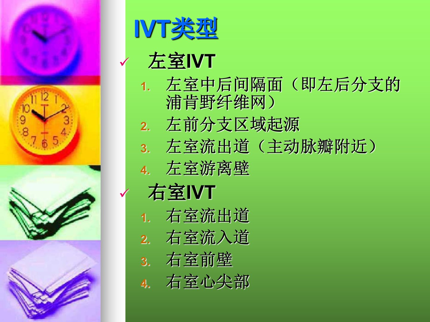 特发性室性心动过速(IVT)是发生于无明显器质性心脏病患者的室速发生率约占室速的10预后一般良好。IVT类型多样包括左室IVT和右室IVT。左室IVT可起源于左室中后间隔面、左前分支区域、左室流出道及左室游离壁其心电图QRS多呈右束支阻滞形态宽度较窄电轴可左偏或极度右偏不同起源点的心电图特征有所不同。右室IVT可起源于右室流出道、右室流入道、右室前壁及右室心尖部心电图多呈左束支阻滞图形QRS宽度不一起源点高低可通过胸导联RS移行情况判断不同起源点的心电图在电轴、导联主波方向等方面也有所区别。