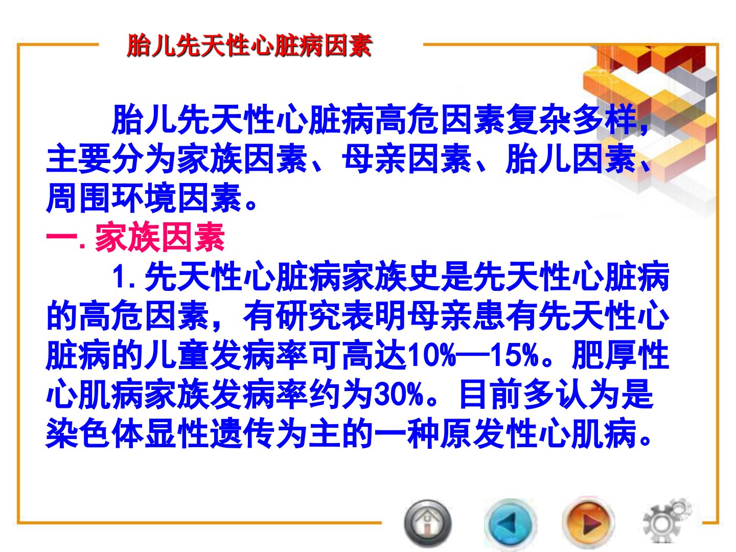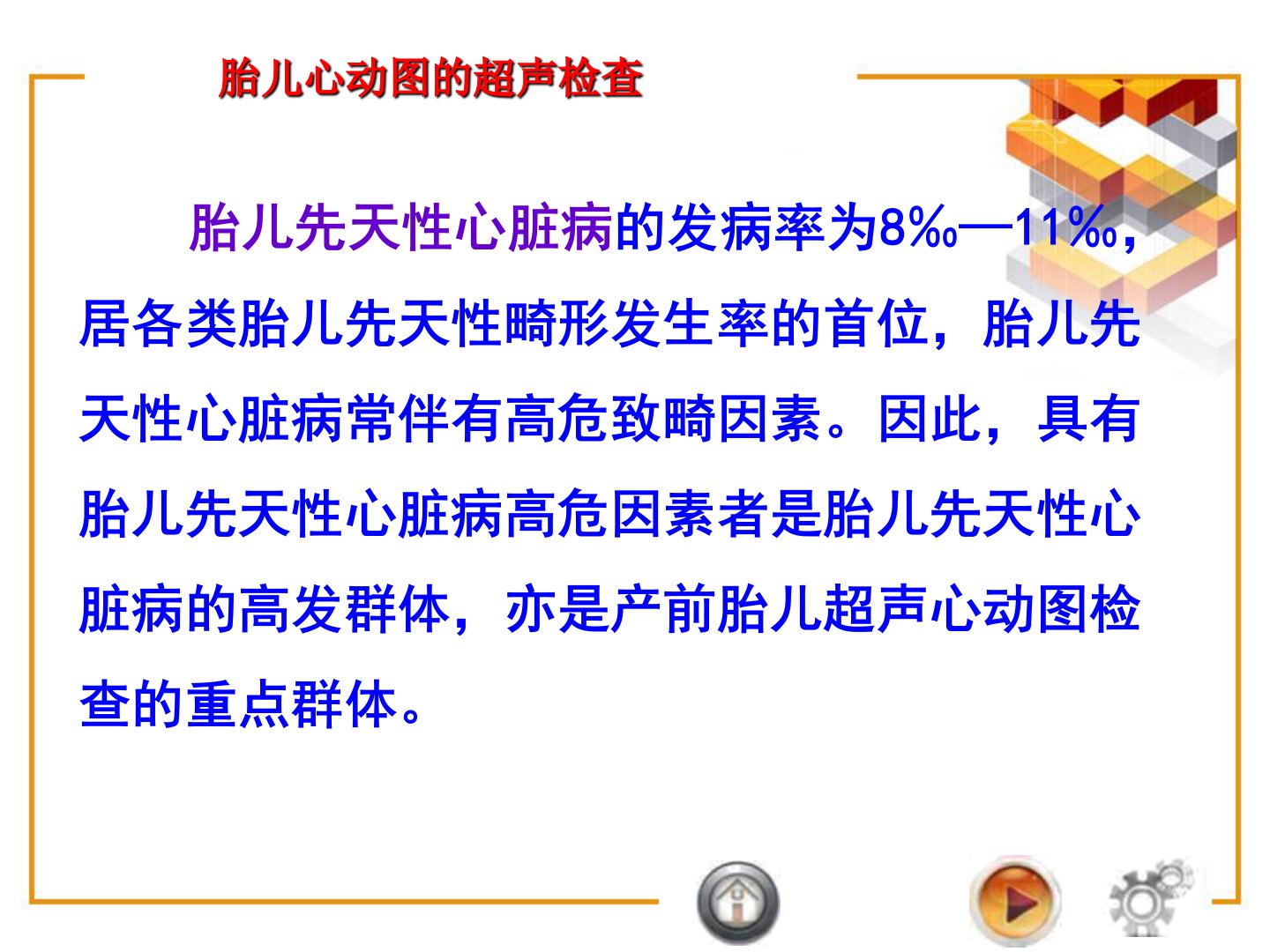 胎儿先天性心脏病发病率高居胎儿先天性畸形之首常伴有高危致畸因素故具有胎儿先天性心脏病高危因素者是产前胎儿超声心动图检查的重点群体。其高危因素复杂多样主要分为:一、家族因素如先天性心脏病家族史、某些常染色体显性遗传性疾病;二、母亲因素如母亲患糖尿病、结缔组织病等妊娠期感染、用药不当、酗酒、高龄及异常妊娠史等;三、胎儿因素如染色体异常、宫内发育迟缓、心律失常、水肿、脏器发育异常及羊水过多过少等;四、其他因素如孕妇接触放射线等有害物质。因绝大多数胎儿先天性心脏病难以找到确切原因故开展常规胎儿超声心动图检查对产前检出胎儿先天性心脏病尤其是严重病例具有非常重要的临床意义。建议孕妇在2428周进行常规超声检查存在高危因素者应做更详细专项检查。
